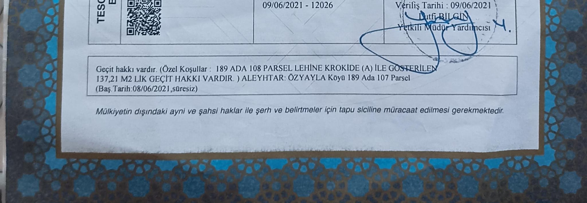 Erişim ve yol durumu: Parselin yolu mevcut; yol, bir önceki parsel sahibine bedel ödenerek tapuya eklenmiş (tapu yol irtifakı/tevhidi sağlanmış).