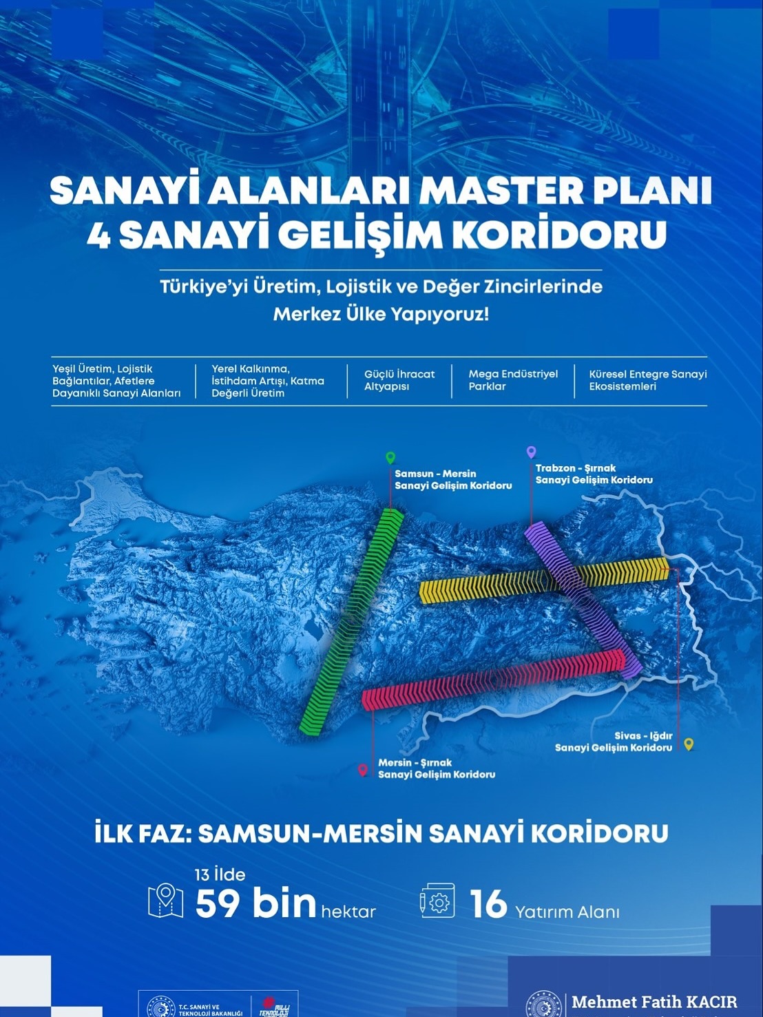 Sanayi ve Teknoloji Bakanlığı tarafından hazırlanan Sanayi Alanları Master Planı’nın ilk fazı kapsamında, Samsun–Mersin hattı üzerinde yer alan ve Nevşehir’in de aralarında bulunduğu 13 ilde, toplam 59 bin hektarlık yeni yatırım alanı ilan edildi.