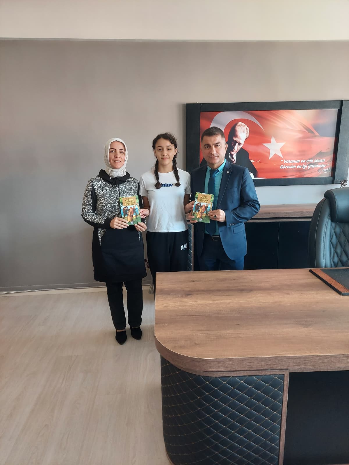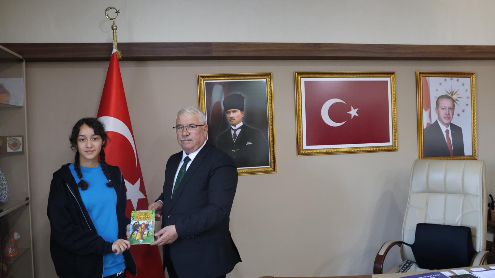 Ebrar Çolak, bu özel anı taçlandırmak amacıyla kendi yazdığı hikâye kitabını da Milli Eğitim Müdürü Yusuf Yazıcı’ya hediye etti.