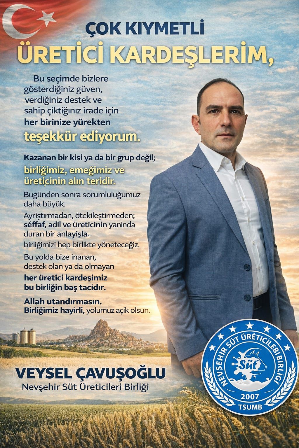 “Çok kıymetli üretici kardeşlerim, bu seçimde bizlere gösterdiğiniz güven, verdiğiniz destek ve sahip çıktığınız irade için her birinize yürekten teşekkür ediyorum. Kazanan bir kişi ya da bir grup değil; birliğimiz, emeğimiz ve üreticinin alın teridir.”
