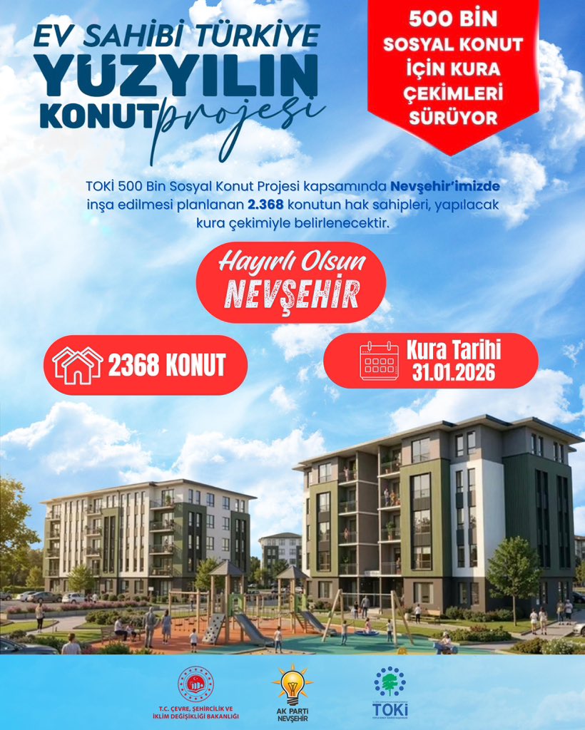 31 Ocak 2026 tarihinde yapılacak kura çekimiyle belirlenecektir.Dar gelirli ailelerimizi güvenli ve modern konutlarla buluşturan bu önemli çalışmanın,