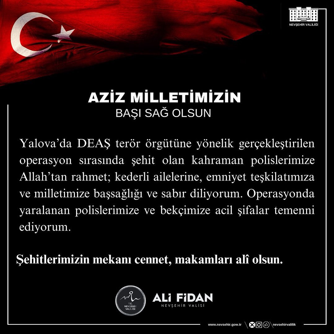 Yalova’da DEAŞ örgütüne yönelik operasyonda şehit olan polislerimiz için Nevşehir Valisi Ali Fidan başsağlığı mesajı yayımladı.