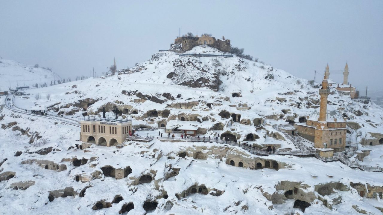 Dünyaca ünlü Kapadokya Peribacaları, tarihi vadiler ve taş yapılar kar yağışıyla birlikte farklı bir güzelliğe büründü. Sabahın ilk ışıklarıyla birlikte ortaya çıkan manzaralar, hem vatandaşlar hem de bölgeyi ziyaret edenler tarafından ilgiyle izlendi. Karla kaplanan vadiler, Kapadokya’nın doğal dokusunu bir kez daha gözler önüne serdi.