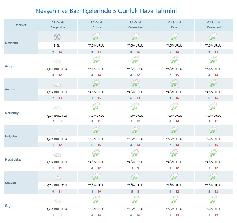 Meteoroloji verilerine göre Nevşehir ve bazı ilçelerinde önümüzdeki 5 gün boyunca yağışlı hava etkili olacak. Hafta boyunca yer yer sis, çok bulutlu hava ve aralıklarla yağmur beklenirken, sıcaklıkların mevsim normalleri civarında seyredeceği tahmin ediliyor.