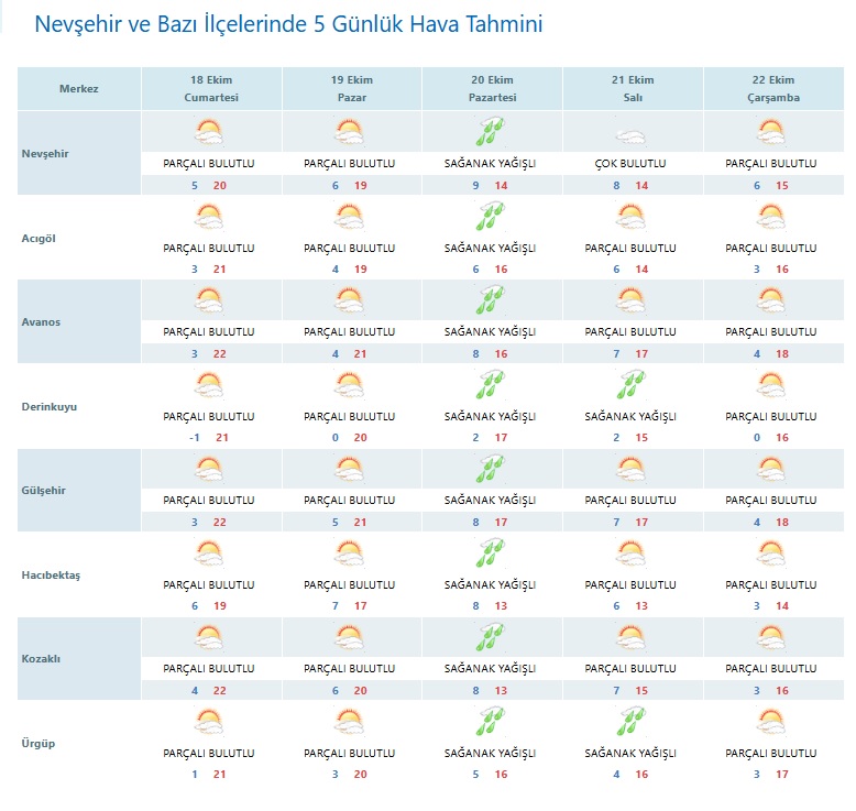Meteoroloji 7. Bölge Müdürlüğü’nün son tahminlerine göre, Nevşehir ve ilçelerinde 18–22 Ekim 2025 tarihleri arasında hava genel olarak parçalı ve az bulutlu geçecek. Ancak hafta sonuna doğru hava koşullarında değişim bekleniyor.