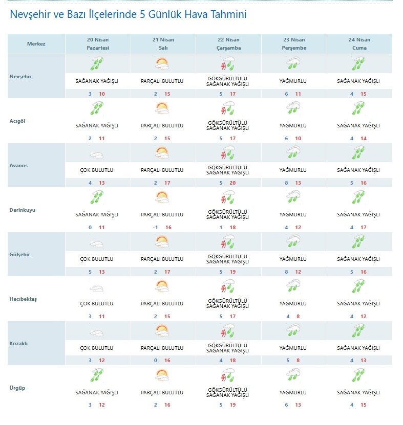 Nevşehir İlçe İlçe 5 Günlük Hava Durumu