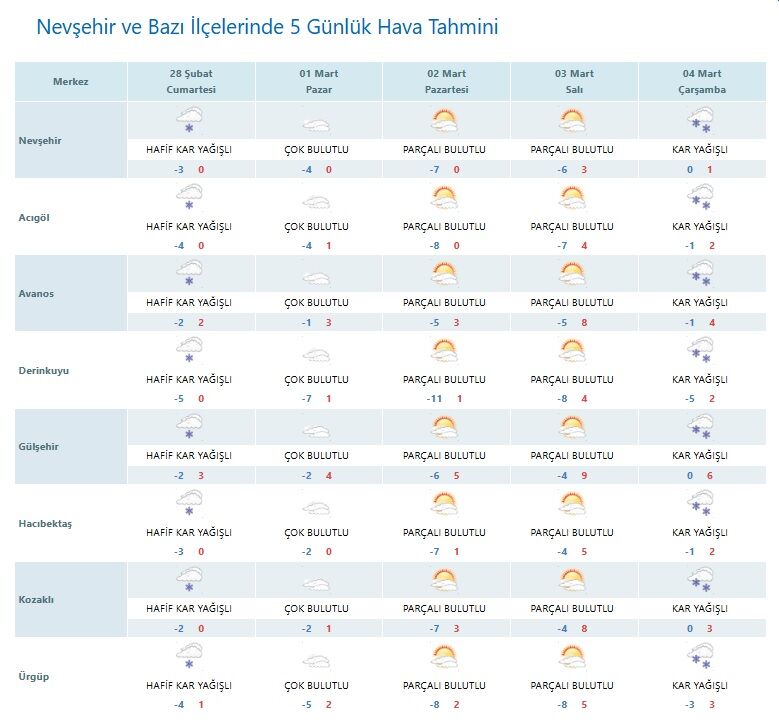 Nevşehir ve ilçelerinde etkili olan kar yağışı önümüzdeki günlerde de devam edecek gibi görünüyor. Meteoroloji verilerine göre, Nevşehir genelinde 28 Şubat Cumartesi günü hafif kar yağışı beklenirken, 1 Mart Pazar ve 2 Mart Pazartesi günleri çok bulutlu ve parçalı bulutlu bir hava hakim olacak. Salı günü tekrar kar yağışı görülmesi öngörülüyor.