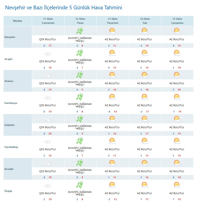 12 Ekim Pazar: Bölge genelinde kuvvetli sağanak yağış etkili olacak. Sıcaklıklar Nevşehir’de 8°C, Derinkuyu’da 8°C, Avanos’ta 9°C civarında seyredecek.