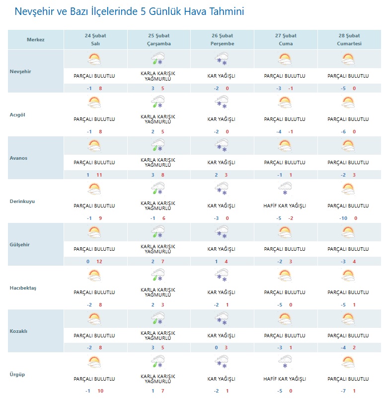Meteoroloji verilerine göre Nevşehir ve bazı ilçelerinde hafta boyunca parçalı bulutlu hava etkili olacak; hafta ortasında ise karla karışık yağmur ve kar yağışı görülecek. Özellikle Çarşamba günü birçok ilçede kar yağışı beklenirken, hava sıcaklıklarında belirgin düşüş yaşanacak.