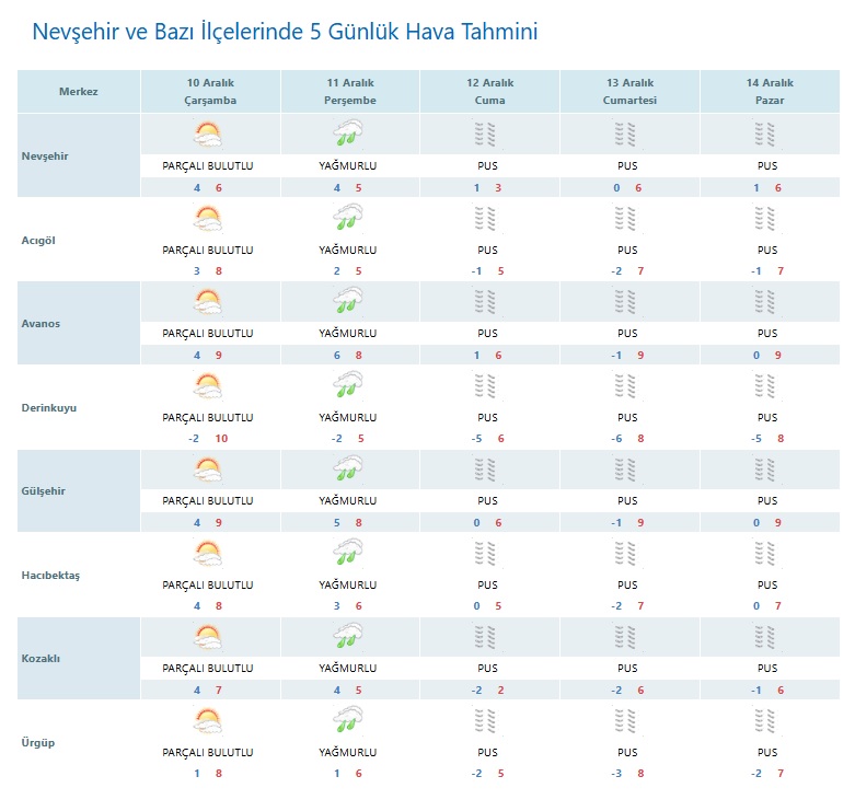 Nevşehir merkezde 10 Aralık Çarşamba günü parçalı bulutlu bir hava bekleniyor. Perşembe günü yağmur etkisini gösterirken, cuma, cumartesi ve pazar günleri puslu hava öne çıkacak.