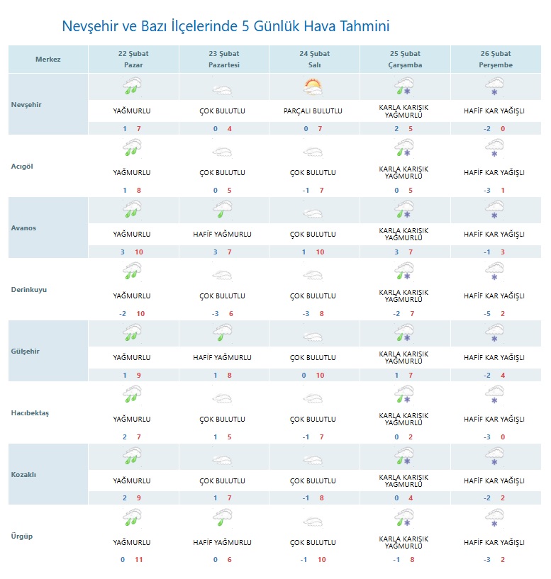 Nevşehir ve ilçelerinde 22–26 Şubat tarihlerini kapsayan 5 günlük hava tahminine göre, hafta sonu yağışlı hava etkisini gösterirken, hafta ortasına doğru soğuk hava dalgası ile birlikte kar yağışı görülecek.
