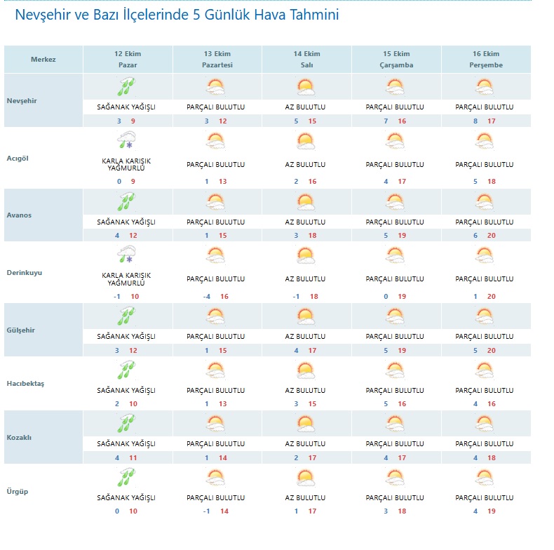 12 Ekim Pazar günü Nevşehir merkez ve ilçelerinde sağanak yağış ile karla karışık yağmur beklenirken, 13 Ekim Pazartesi’den itibaren hava sıcaklıkları kademeli olarak artacak.
