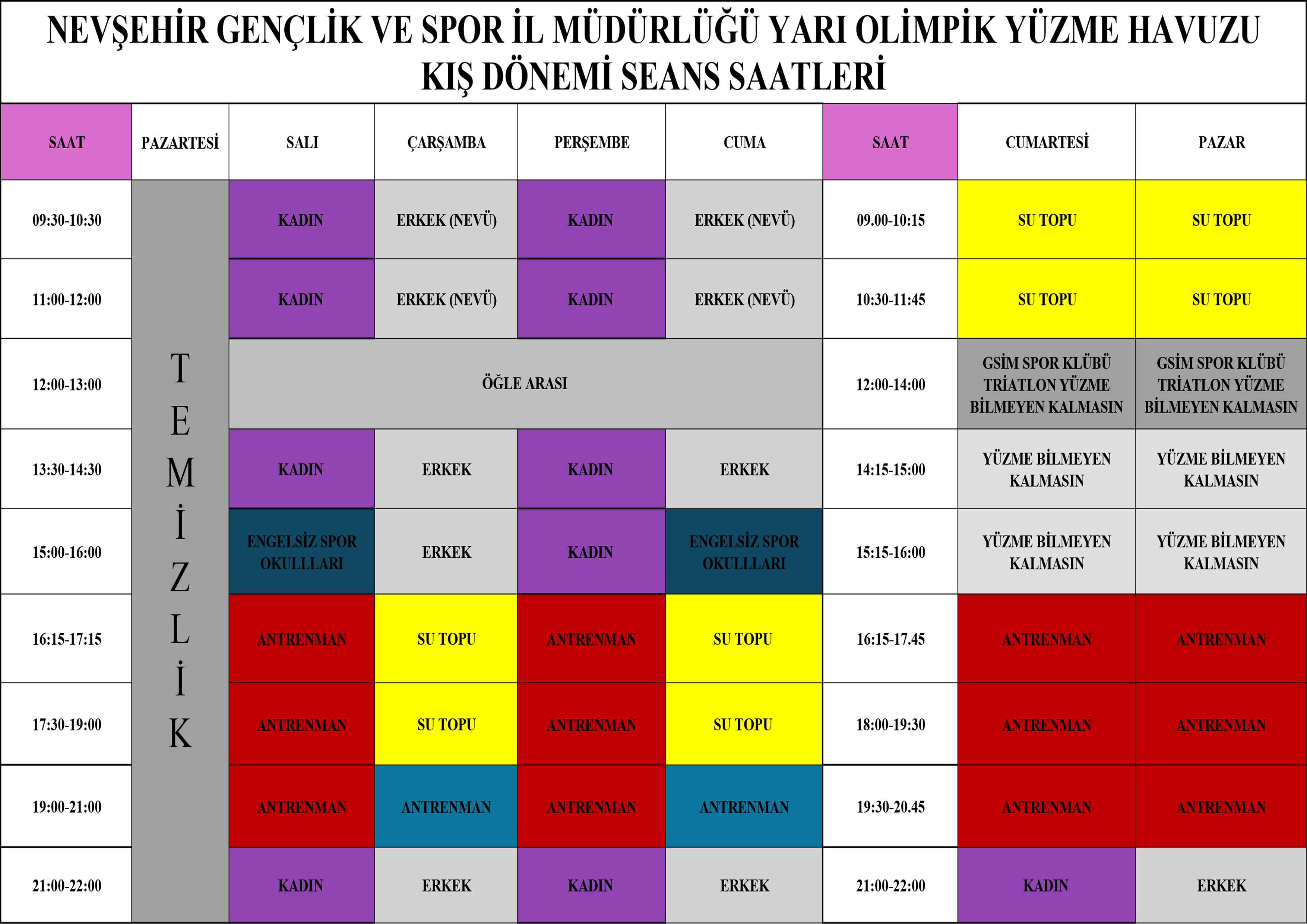 Nevşehir Gençlik ve Spor İl Müdürlüğü’ne bağlı Yarı Olimpik Yüzme Havuzu, 2026 kış dönemi için hazırlanan yeni programıyla kapılarını sporseverlere açıyor. Soğuk havalara rağmen sporu ve eğlenceyi bir araya getiren havuz programı, her yaştan vatandaşa hitap eden geniş bir içerik sunuyor.