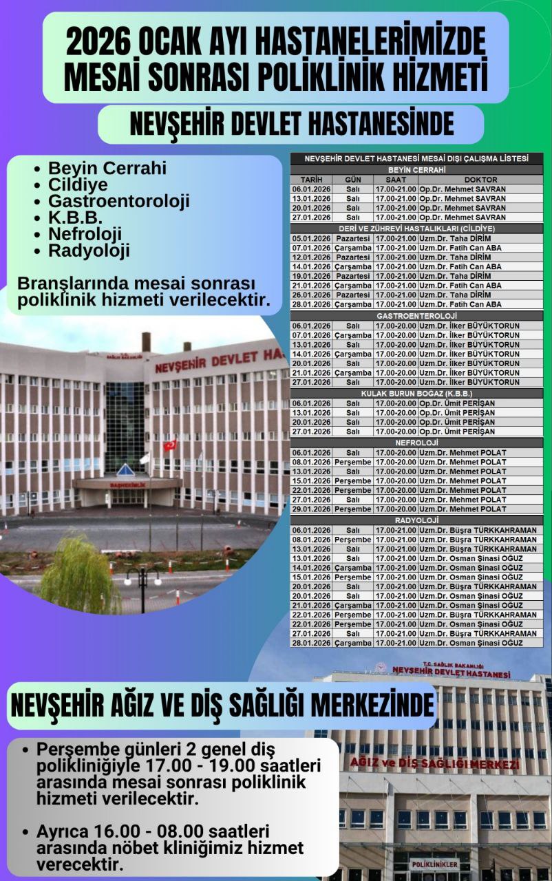 Nevşehir Devlet Hastanesi’nde Ocak ayı boyunca mesai sonrası poliklinik hizmeti şu branşlarda verilecek: