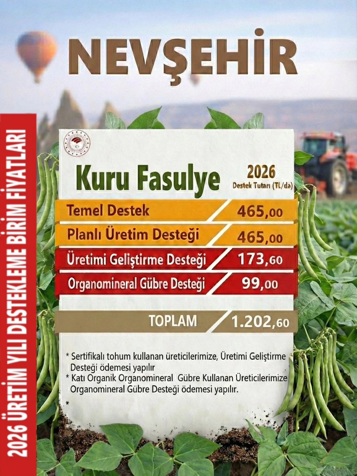2026 üretim yılı kapsamında kuru fasulye üreten çiftçilere dekar başına sağlanacak destek kalemleri şu şekilde belirlendi: