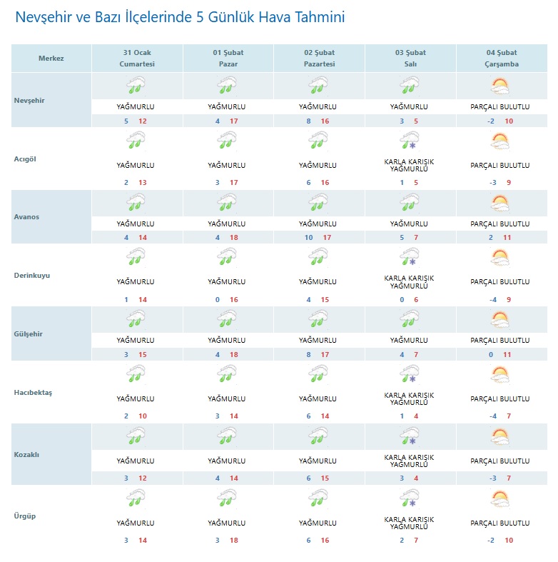 Meteoroloji Genel Müdürlüğü verilerine göre, Nevşehir ve ilçelerinde önümüzdeki 5 gün boyunca yağışlı hava etkisini sürdürecek. Hafta sonu ve hafta başında yağmur, yüksek kesimlerde ise karla karışık yağmur bekleniyor. Sıcaklıkların özellikle salı gününden itibaren hissedilir derecede düşmesi öngörülüyor.