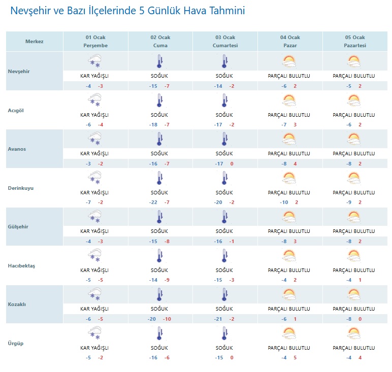 | Nevşehir | Kar yağışlı -4 / -3°C | Soğuk -15 / -7°C | Soğuk -14 / -2°C | Parçalı bulutlu -6 / 2°C | Parçalı bulutlu -5 / 2°C |