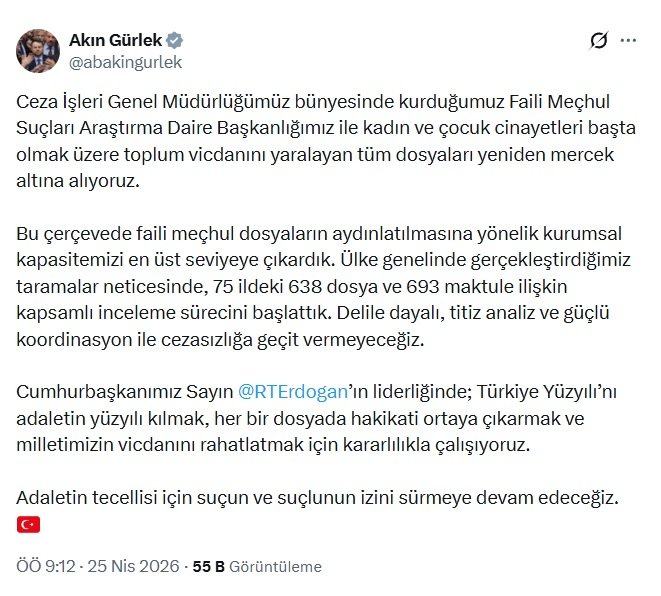 Adalet Bakanı Akın Gürlek; "Ceza İşleri Genel Müdürlüğümüz bünyesinde kurduğumuz Faili Meçhul Suçları Araştırma Daire Başkanlığımız ile kadın ve çocuk cinayetleri başta olmak üzere toplum vicdanını yaralayan tüm dosyaları yeniden mercek altına alıyoruz.