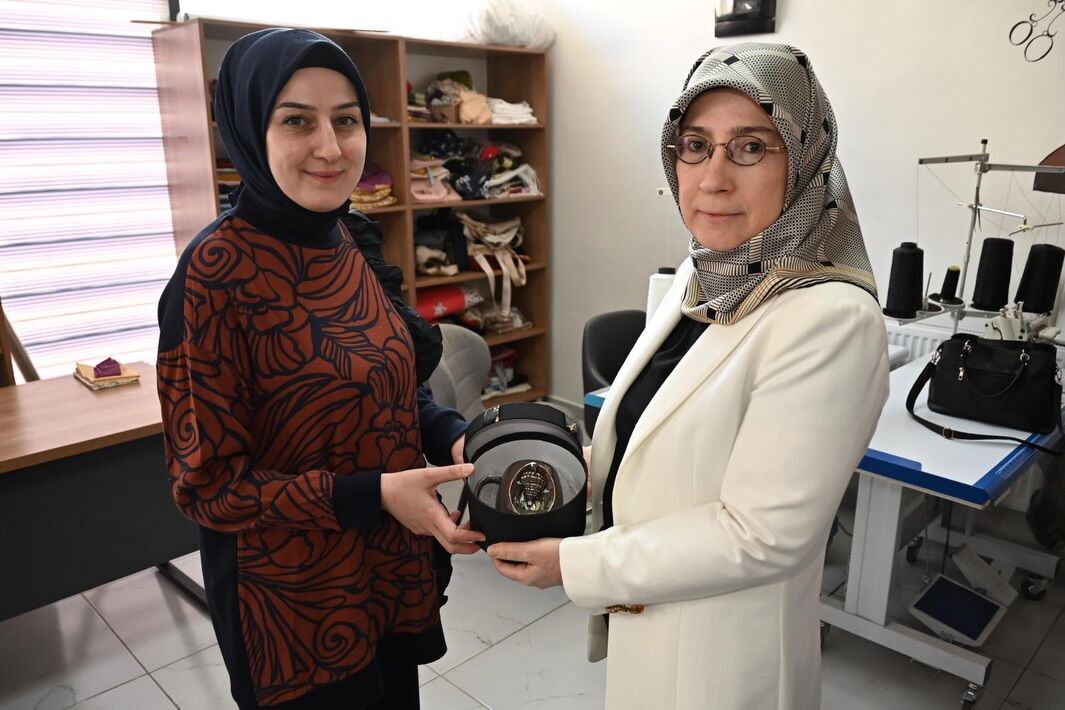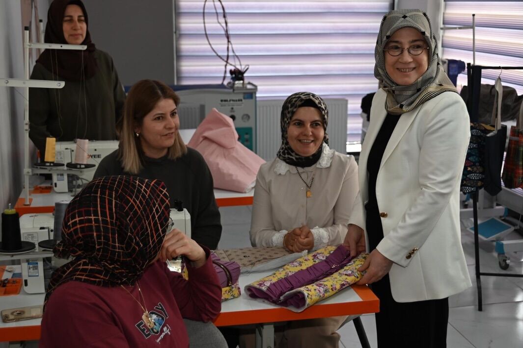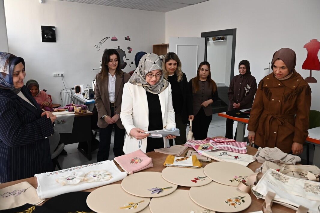 Prof. Dr. Fatma Fidan, ziyaret kapsamında kursiyerlerle sohbet ederek yürütülen çalışmalar hakkında yetkililerden bilgi aldı. El emeğiyle hazırlanan ürünleri tek tek inceleyen Hanımefendi, kursiyerlerin azim ve özverilerini takdir etti.