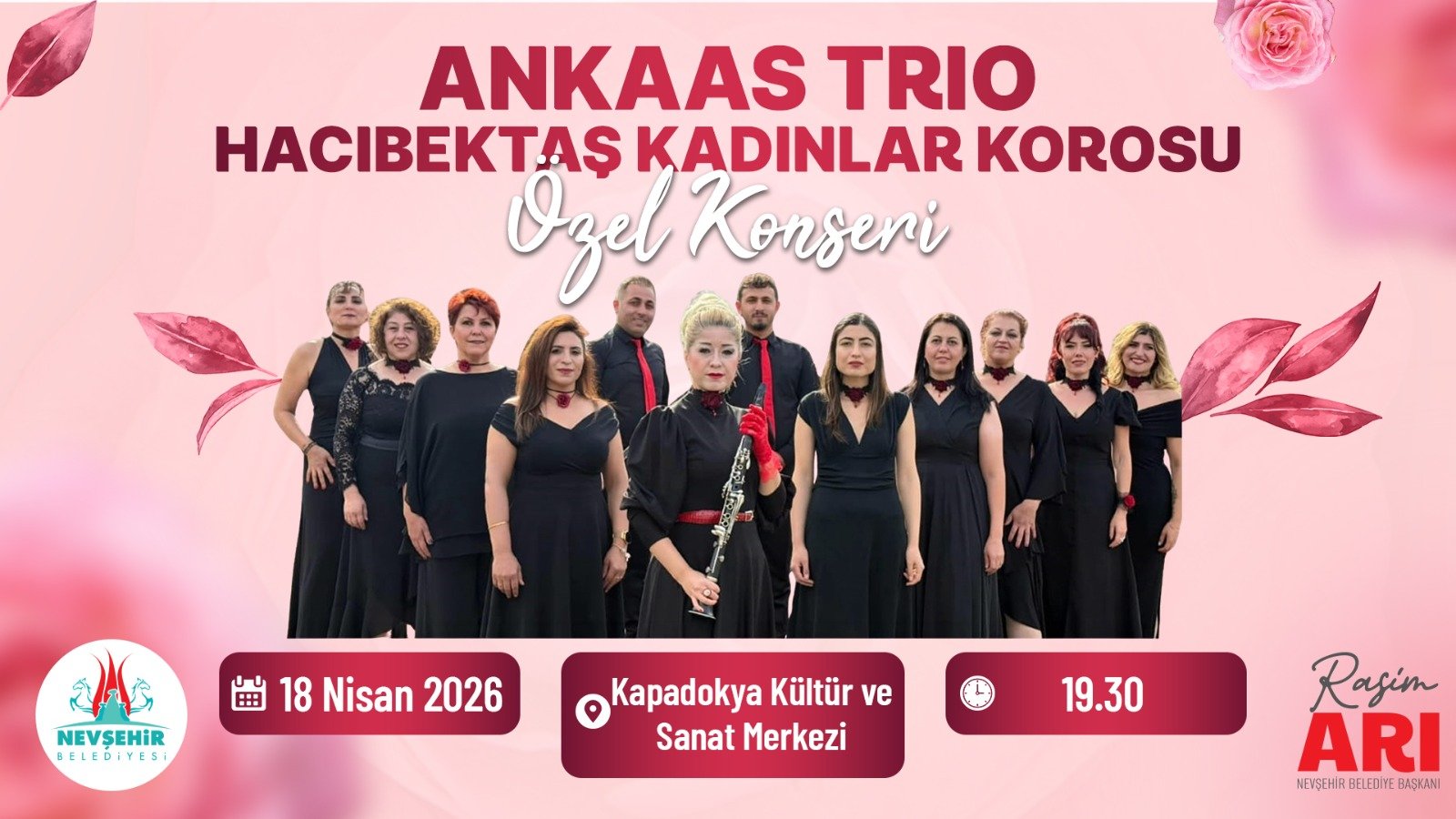 Nevşehir Belediyesi Kültür, Sanat ve Sosyal İşler Müdürlüğü organizasyonuyla 18 Nisan 2026 Cumartesi günü saat 19.30’da Kapadokya Kültür ve Sanat Merkezi’nde gerçekleştirilecek konser etkinliği kapsamında zengin repertuvarıyla sahne alacak olan AnKaAs Üçlüsü ve Hacıbektaş Kadınlar Korosu; “Ben Bir Göçmen Kızı Gördüm Tuna Boyunda”, “Ağaçlıktan Arar Gelir”, “Derd’e Düştüm Dermanını Ararım”, “Mağusa Limanı”, “Gönlüm Ataşlara Yandı Gidiyor” gibi eserlerle dinleyicilerden büyük beğeni toplaması bekleniyor.