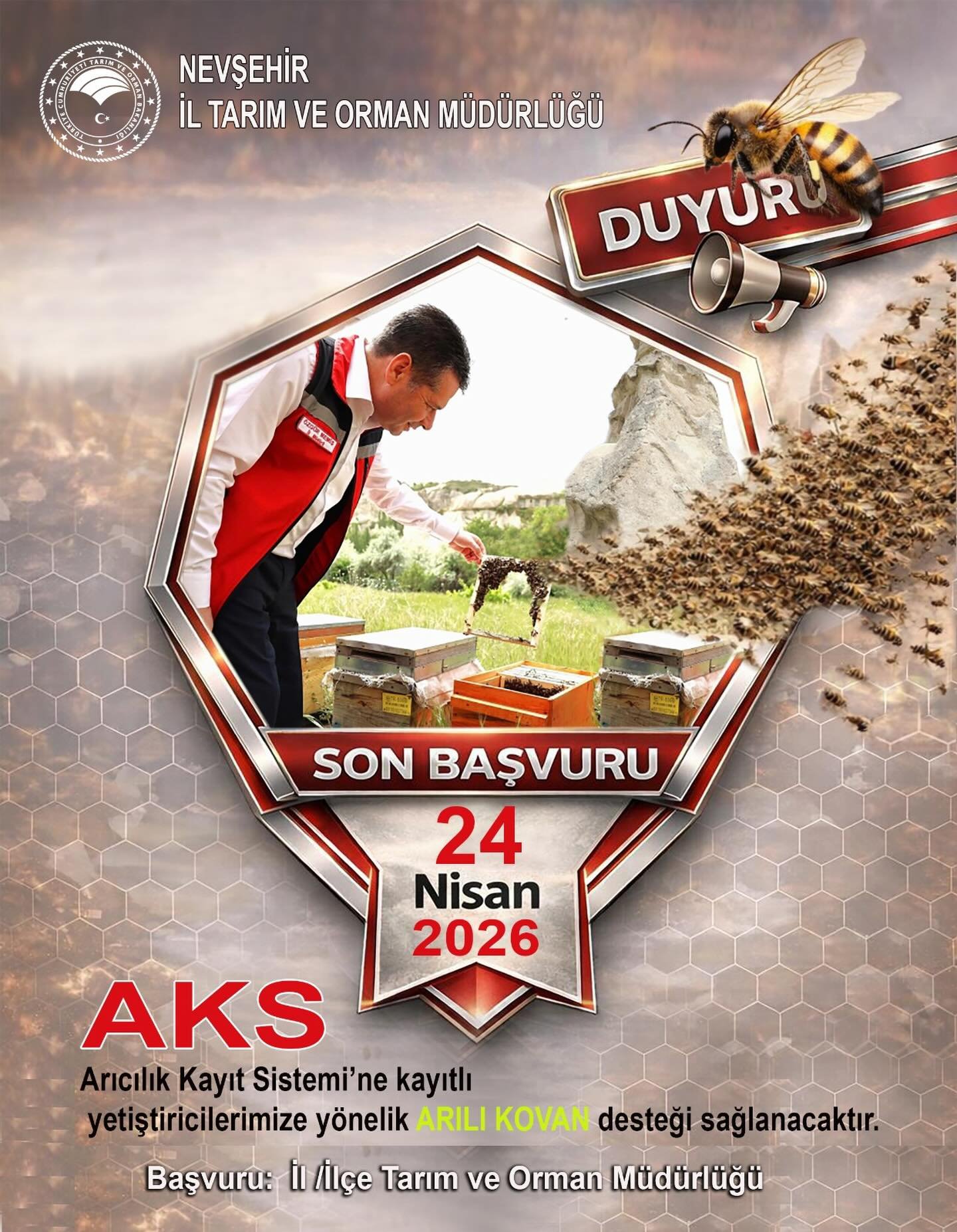 Başvurular için son tarihin 24 Nisan 2026 olduğu hatırlatılırken, destekten faydalanmak isteyen arıcıların İl ve İlçe Tarım ve Orman Müdürlüklerine müracaat etmeleri gerektiği ifade edildi.