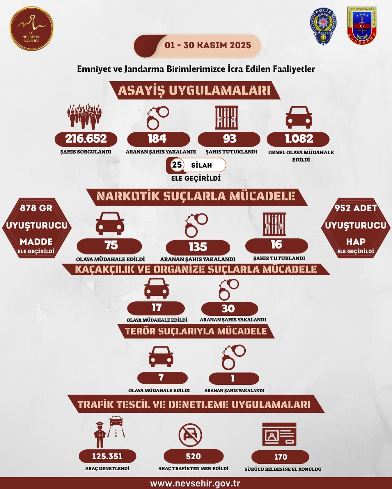 Nevşehir Valiliği, şehrin huzur ve güvenliğini sağlamak amacıyla Emniyet ve Jandarma birimlerinin 2025 yılı Kasım ayı faaliyetlerini açıkladı. Yapılan açıklamada, yürütülen çalışmaların kesintisiz ve kararlı bir şekilde devam ettiği vurgulandı.