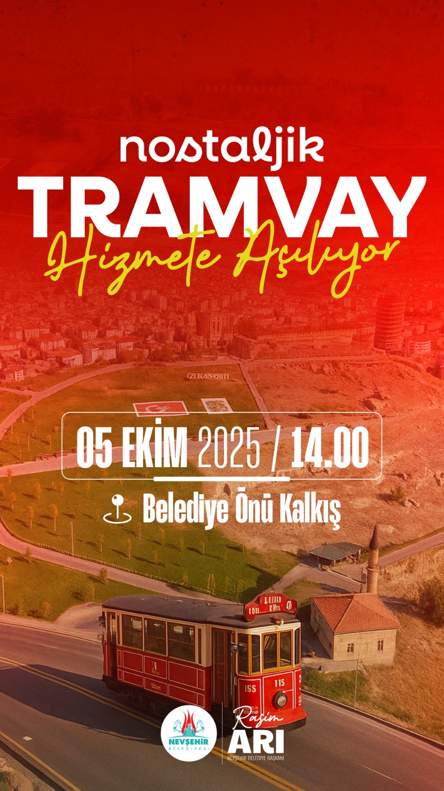 Nevşehir Belediye Başkanı Rasim Arı’nın 50 Vizyon Projesi’nden birisi ve Nevşehir tarihinde bir ilk olan Tramvay, 05 Ekim 2025 Pazar günü yarın saat 14.00’de Nevşehir Belediyesi’nin önünden hareket ederek ilk yolculuğuna çıkacak.