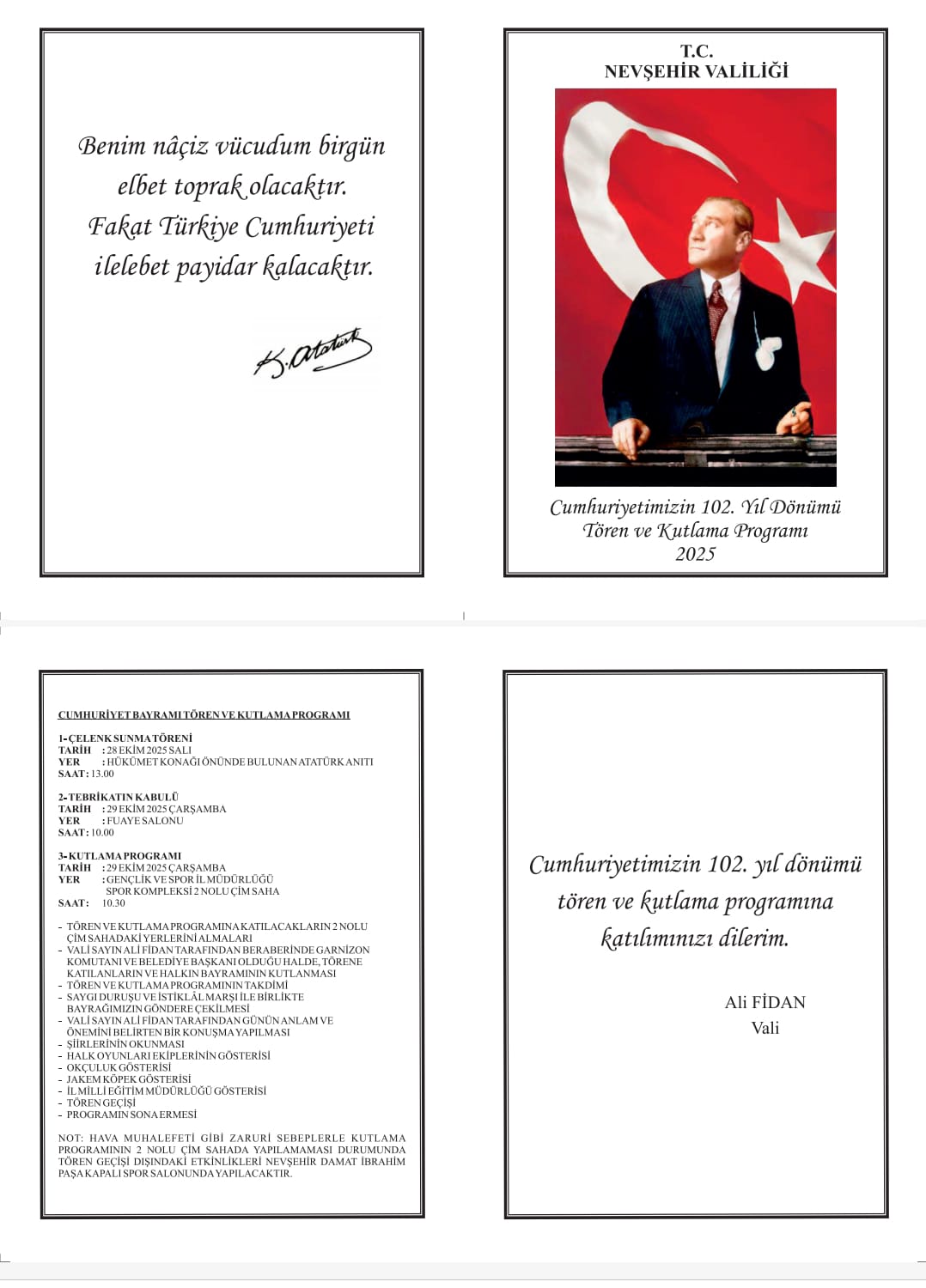 29 Ekim 2025 Çarşamba günü saat 10.00’da Nevşehir Valiliği Fuaye Salonu’nda tebrikat töreni düzenlenecek. Vali Ali Fidan, Garnizon Komutanı ve Nevşehir Belediye Başkanı ile birlikte tebrikleri kabul edecek.