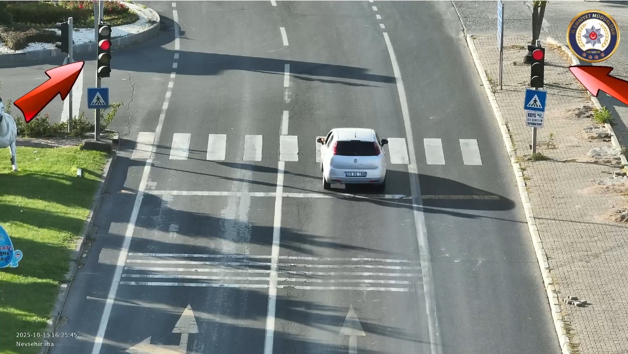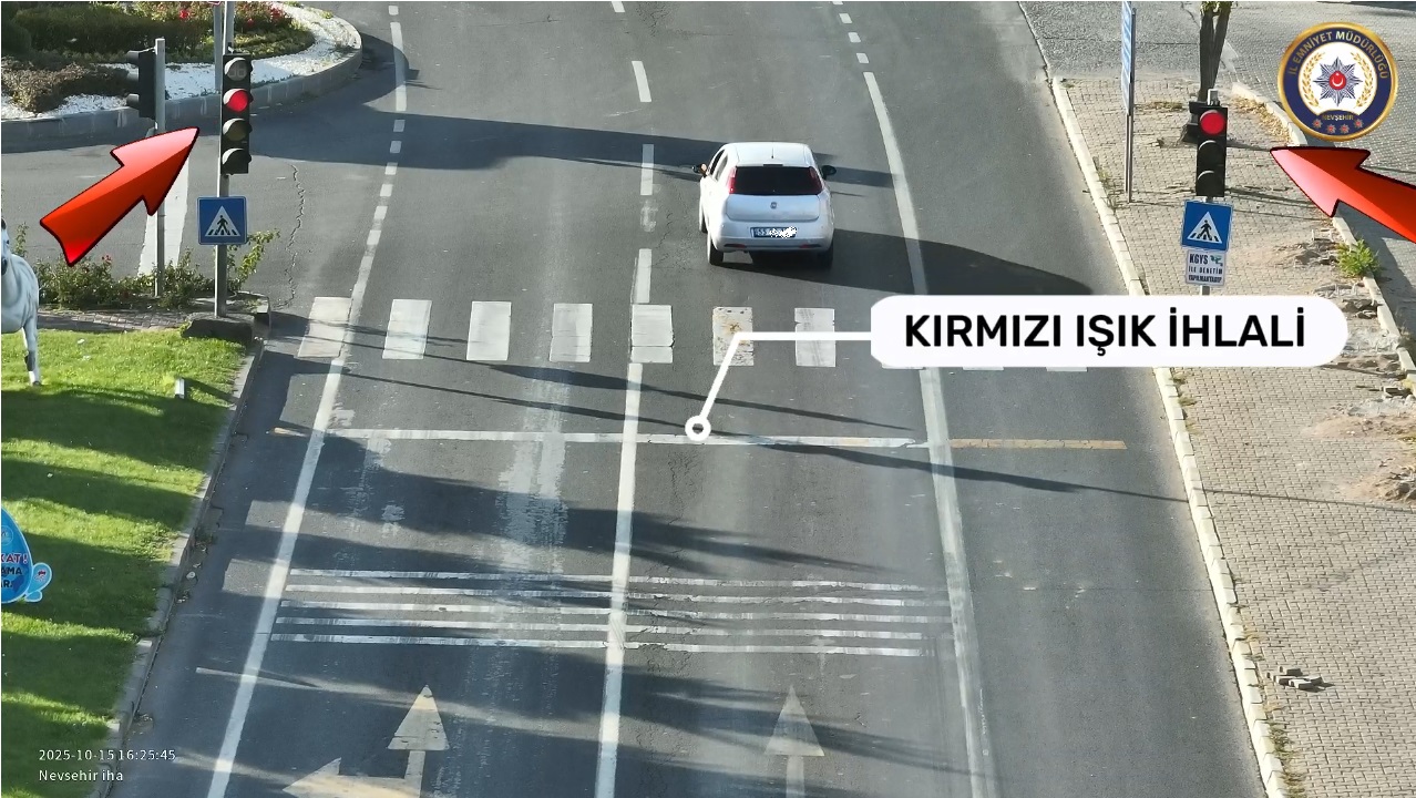 Nevşehir'de dron desteğiyle yapılan kırmızı ışık ihlali denetiminde kurallara uymayan sürücülere para cezası uygulandı.