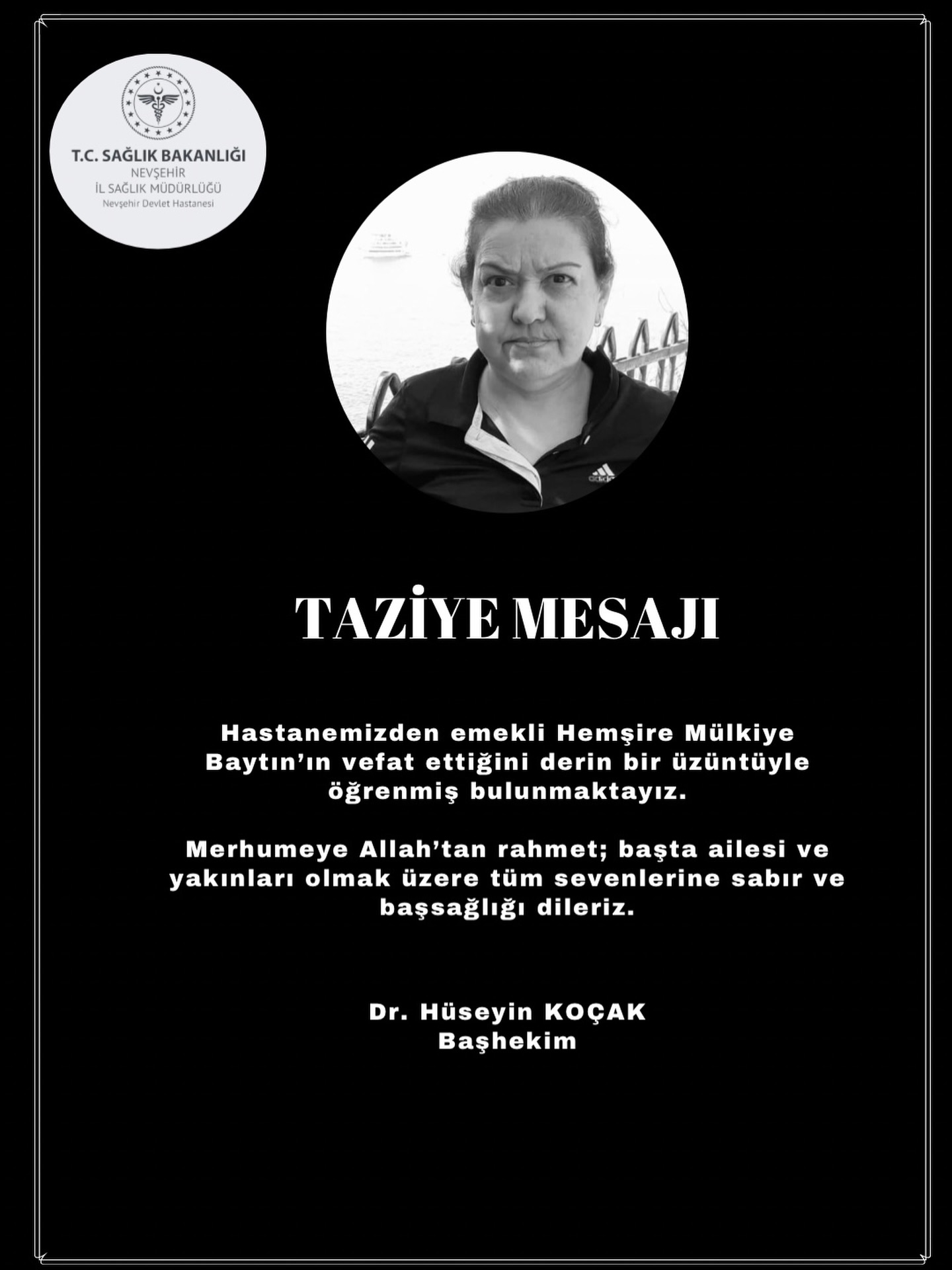Nevşehir Devlet Hastanesinden emekli hemşire Mülkiye Baytın’ın vefatını derin bir üzüntüyle öğrendiğimizi belirten Başhekim Dr. Hüseyin Koçak, merhumeye Allah’tan rahmet; başta ailesi ve yakınları olmak üzere tüm sevenlerine sabır ve başsağlığı diledi.