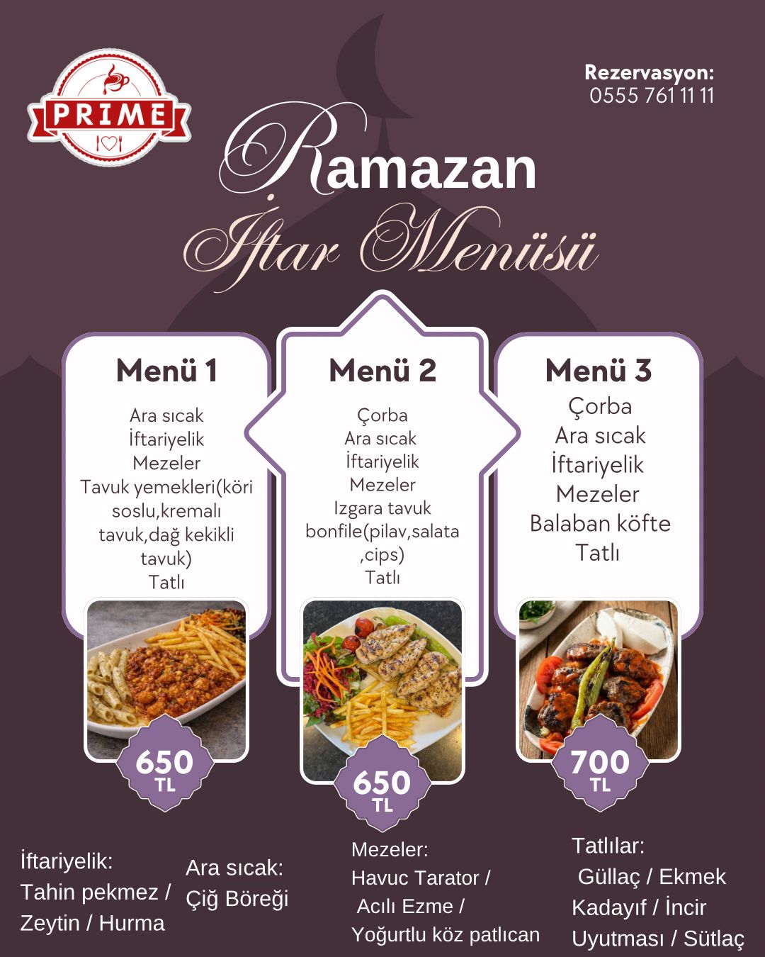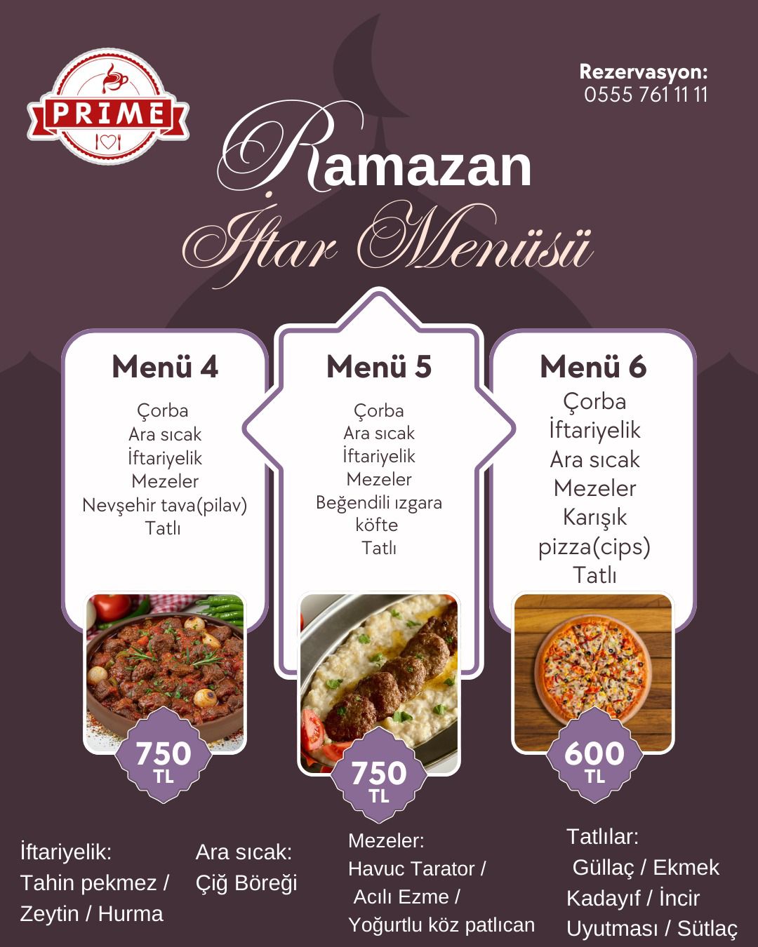 Prime Cafe’de sunulan iftar menüleri, sıcacık çorba ile başlıyor; zengin mezeler, ara sıcaklar ve doyurucu ana yemeklerle devam ediyor. İftar keyfi, tatlı ve demli çay ikramıyla tamamlanıyor.
