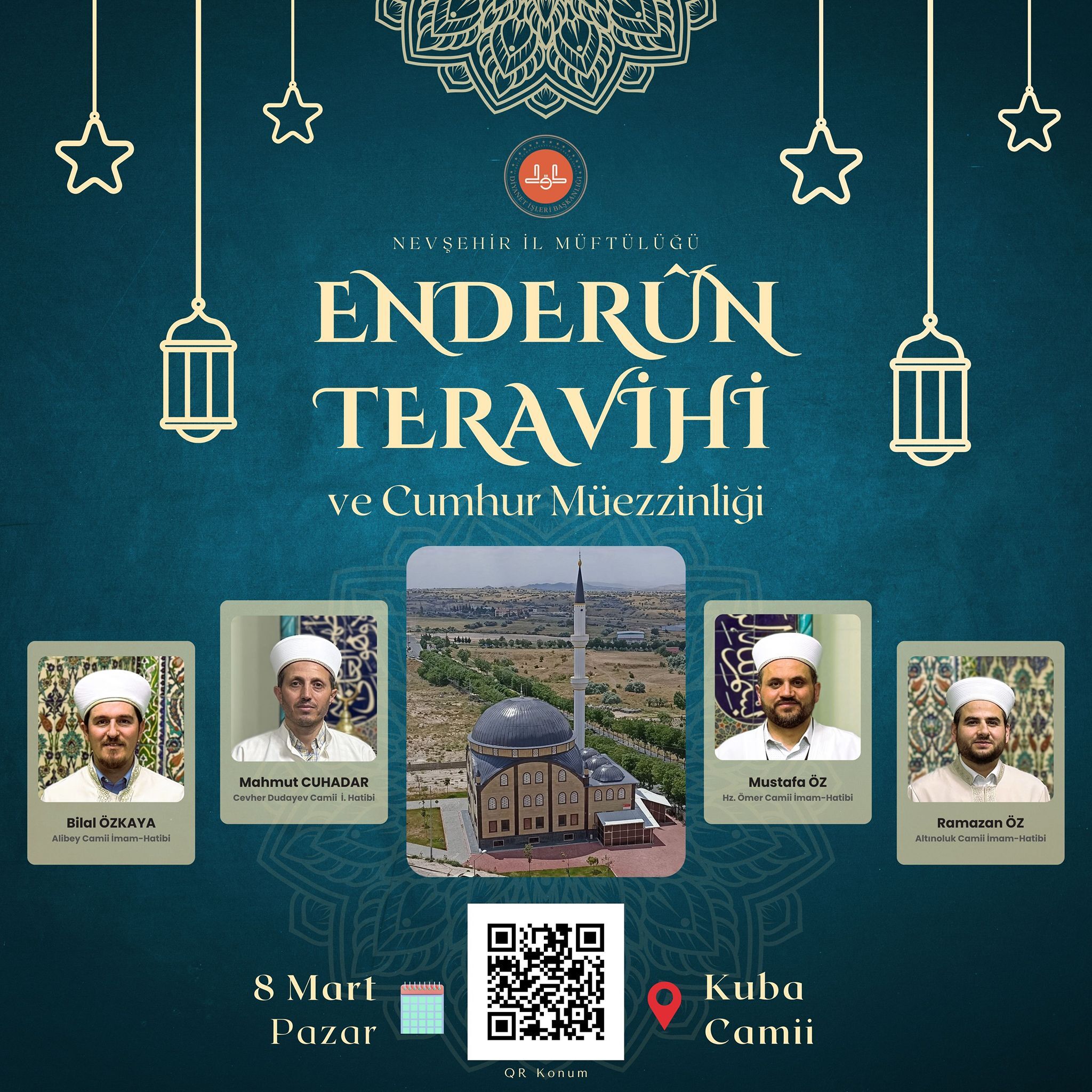 Nevşehir İl Müftülüğü, Ramazan ayının manevi atmosferini daha da derinden yaşatmak amacıyla Enderun Teravihi ve Cumhur Müezzinliği programı düzenleyecek. Program, 8 Mart Pazar günü Kuba Camii’nde gerçekleştirilecek.