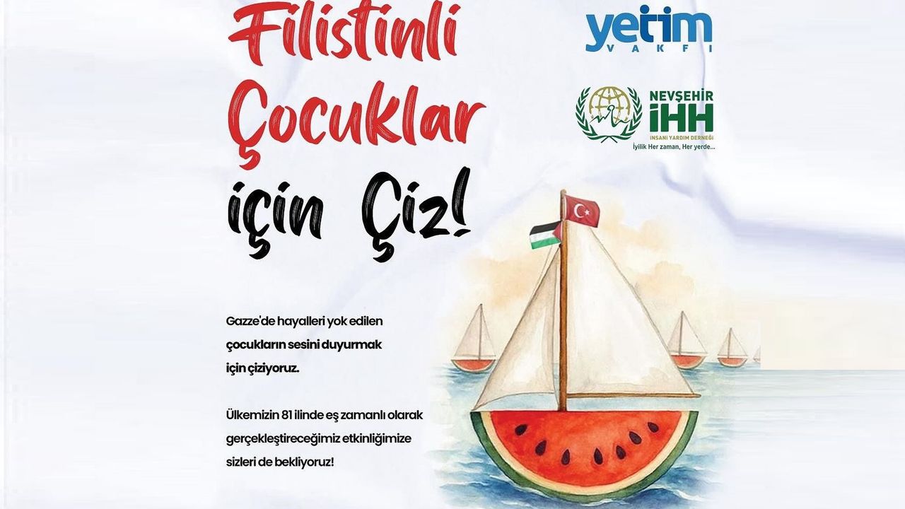 Yetim Vakfı ve İnsanî Yardım Derneği iş birliğiyle düzenlenen “Filistinli Çocuklar İçin Çiz!” etkinliği, Gazze’de hayalleri yok edilen çocukların sesini duyurmayı amaçlıyor. Etkinlik, ülkemizin 81 ilinde eş zamanlı olarak gerçekleştirilecek ve Nevşehir’de de vatandaşlarla buluşacak.