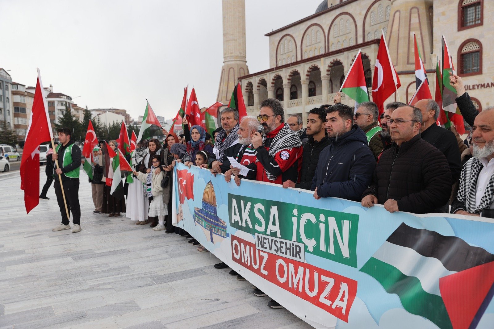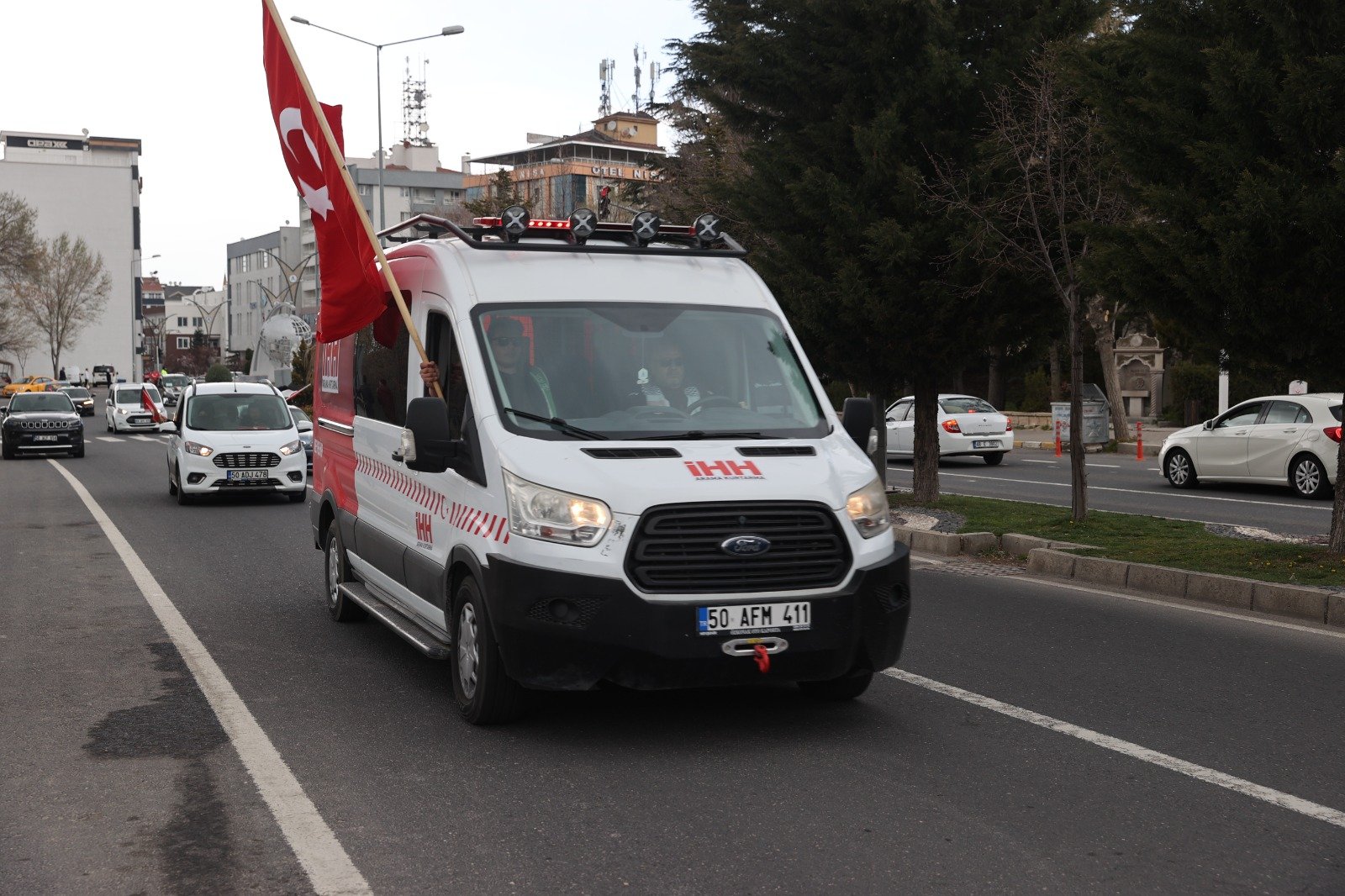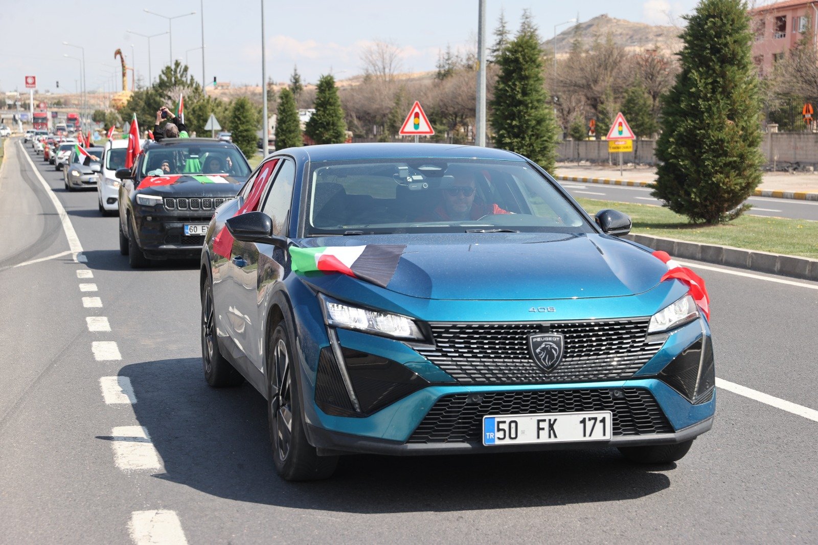 İHH İnsani Yardım Vakfı öncülüğünde bir araya gelen vatandaşlar, Türk ve Filistin bayraklarıyla araçlarını süsleyerek Nevşehir Hacı Bektaş Veli Üniversitesi önünden hareket etti. Konvoy, Nevşehir Külliyesi Hacı Süleyman Köybaşı Camii’ne kadar devam etti.