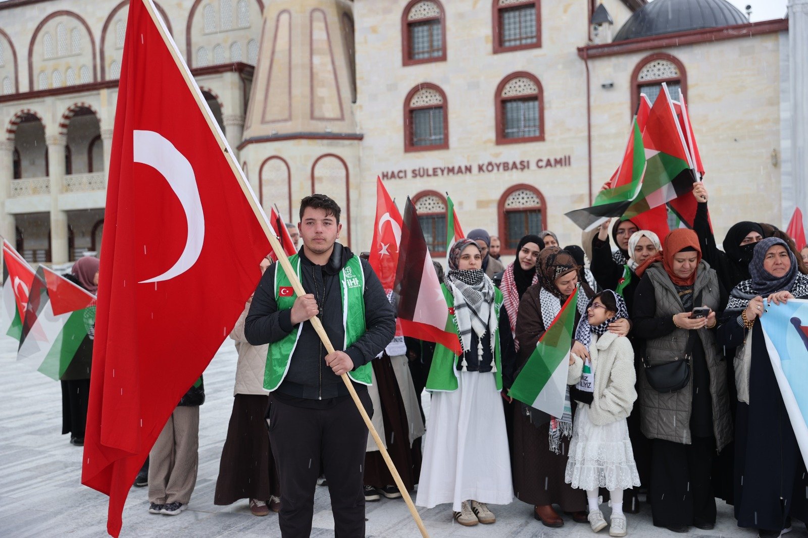 Cadde boyunca ilerleyen konvoya vatandaşlar kaldırım kenarından alkışlarla destek verdi. Programın devamında Külliye önünde toplanan grup tekbir getirerek sloganlarla İsrail’in saldırılarını protesto etti.