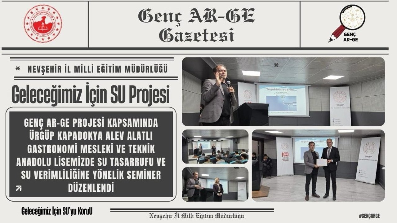 Millî Eğitim Bakanlığı Genç AR-GE faaliyetleri kapsamında yürütülen “Geleceğimiz İçin Su” projesi çerçevesinde Nevşehir’de öğrencilerin su verimliliği bilinci kazanmasına yönelik eğitim ve farkındalık çalışmaları gerçekleştirildi.