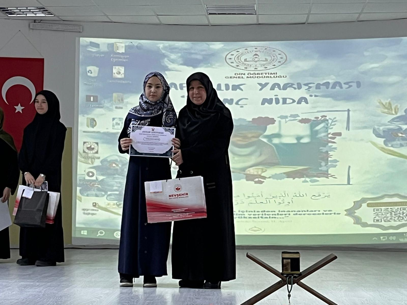 Yarışmalar sonucunda il birincisi olan Aysima Cankaloğlu (Yunus Emre İmam Hatip Ortaokulu) ve Fatma Zehra Cingitaş (Karapınar İmam Hatip Ortaokulu), bölge finallerinde Nevşehir’i temsil etmeye hak kazandı. Öğrencilerimizin bölge finalinde de aynı başarıyı göstereceklerine olan inanç tamdır.