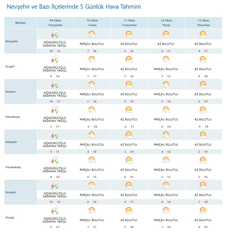 • Nevşehir Merkez: 9 Ekim Perşembe günü gökgürültülü sağanak yağışlı geçecek. 10 Ekim Cuma günü parçalı bulutlu, 11–13 Ekim tarihleri arasında ise az bulutlu bir hava hakim olacak. Sıcaklıklar 4°C ile 17°C arasında değişecek.