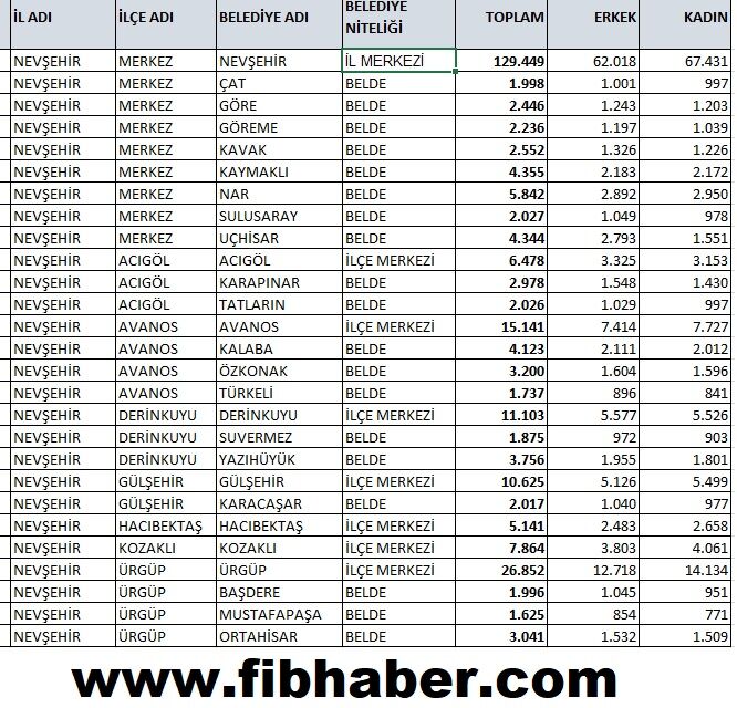 | 50 | 1543 | 3264 | NEVŞEHİR | MERKEZ | GÖRE | BELDE | 2.446 | 1.243 | 1.203 |