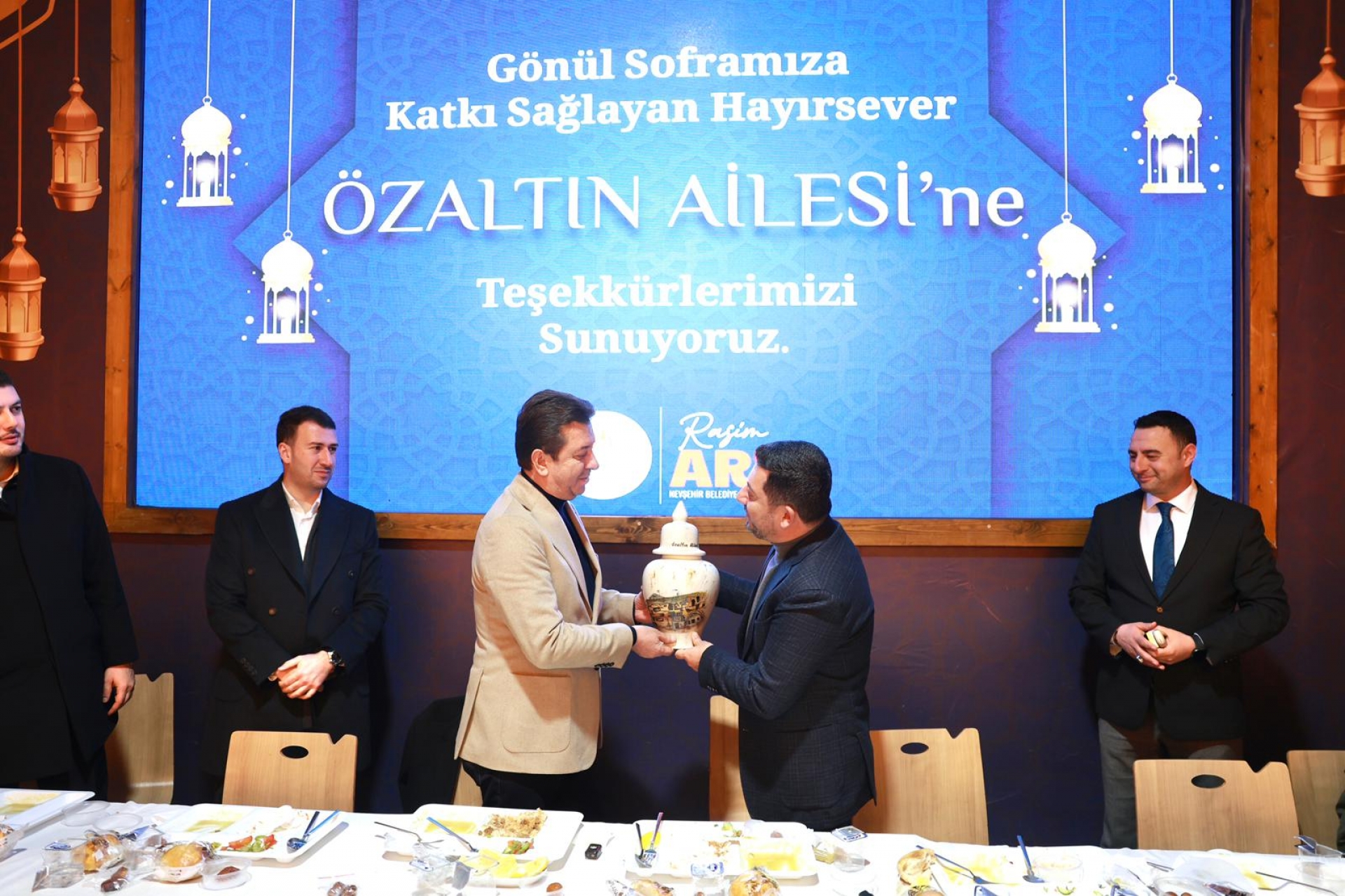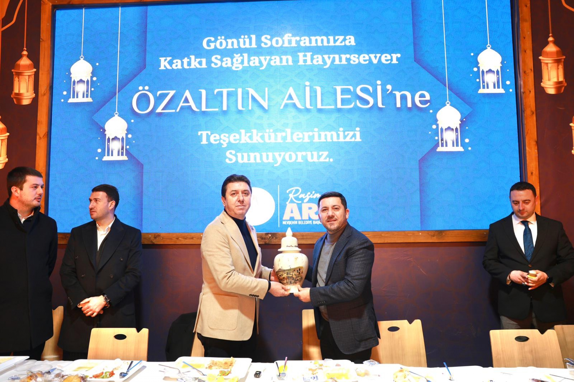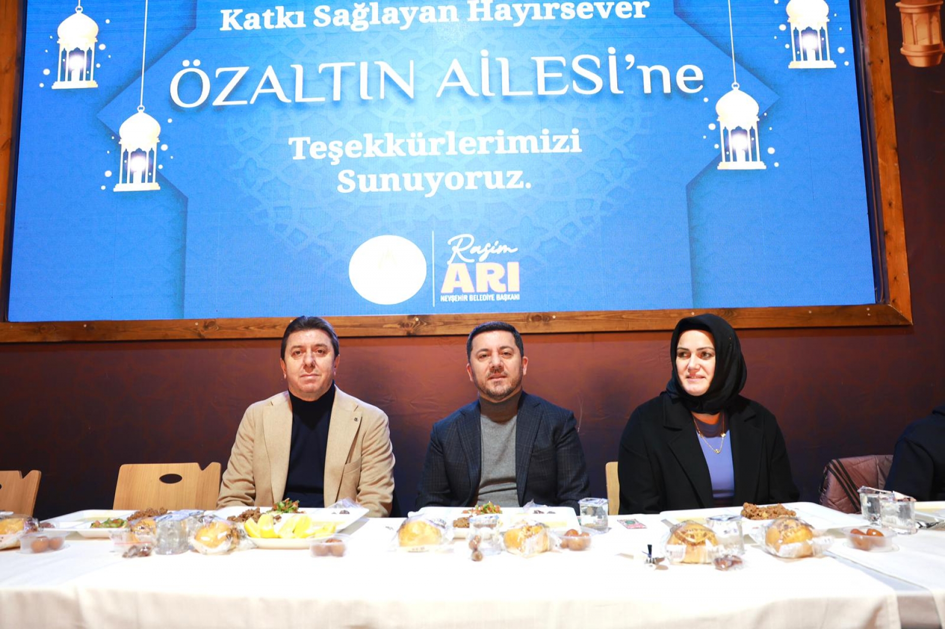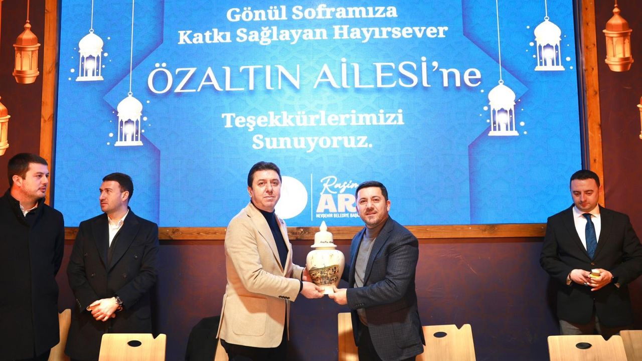 Nevşehir Belediye Başkanı Rasim Arı katkılarından dolayı Özaltın ailesine teşekkür ederek plaket takdim ederek Allah hayrınızı kabul etsin diye konuştu. “Gönüller Bir Soframız Bir” sloganıyla oluşturulan Gönül Sofrasına Nevşehirli genç, yaşlı, çocuk, çalışan, emekli vatandaşlar katıldı. Mercimek çorbası, pilav, Et Kavurma, salata ve tatlı ile süslenen iftar sofrasının birinci gününde, binlerce vatandaş, akşam ezanının okunması ile ilk iftarı yapmanın heyecanını yaşadı.