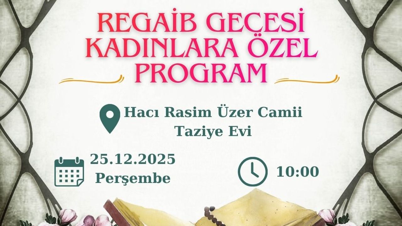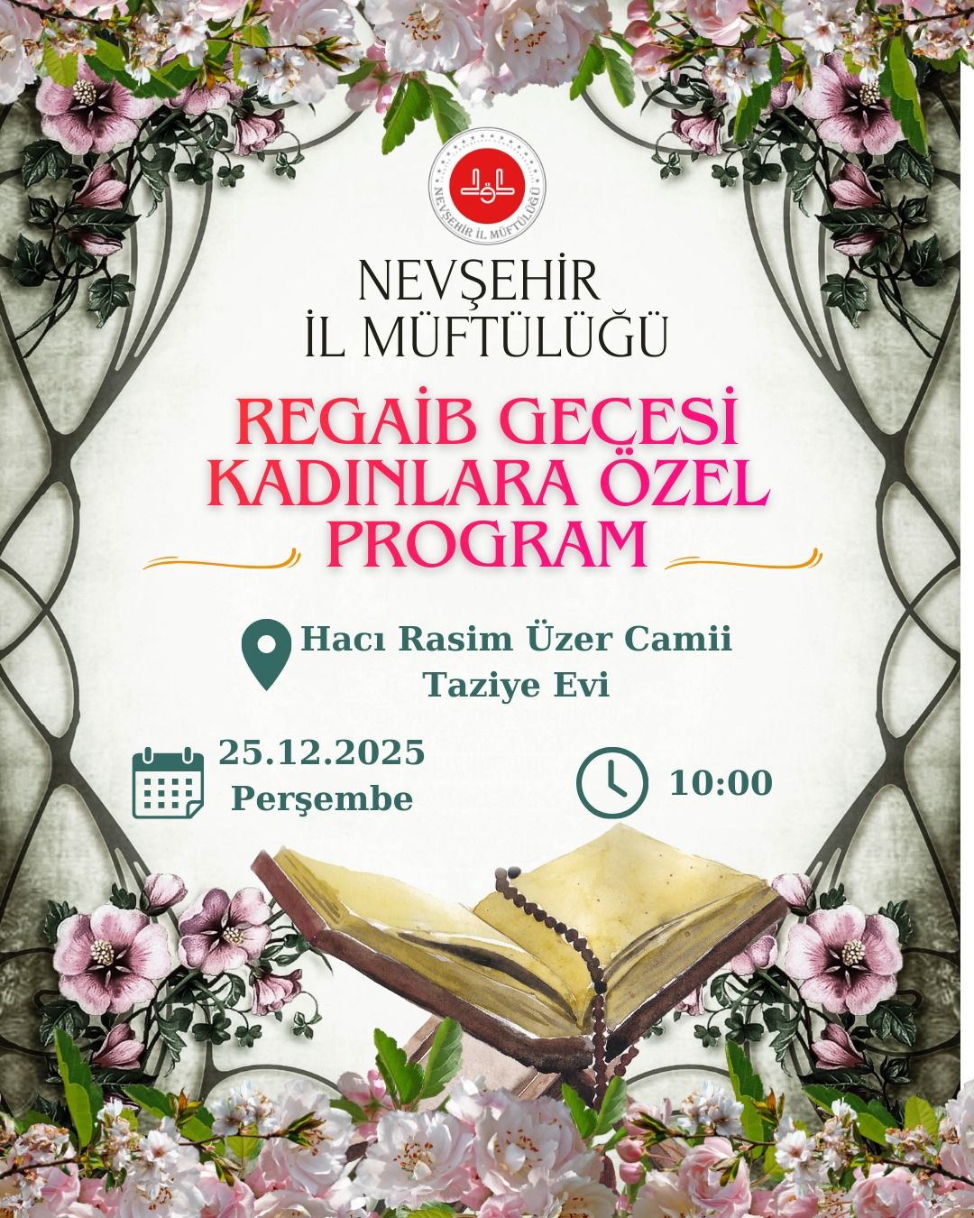 Nevşehir İl Müftülüğü, Regaib Gecesi dolayısıyla kadınlara özel anlamlı bir program düzenliyor. Hacı Rasim Üzer Camii ve Taziye Evi’nde gerçekleştirilecek etkinlik, 25 Aralık 2025 Perşembe günü saat 10.00’da başlayacak.