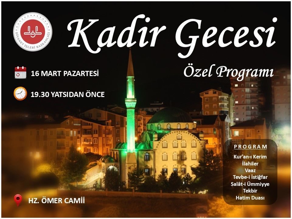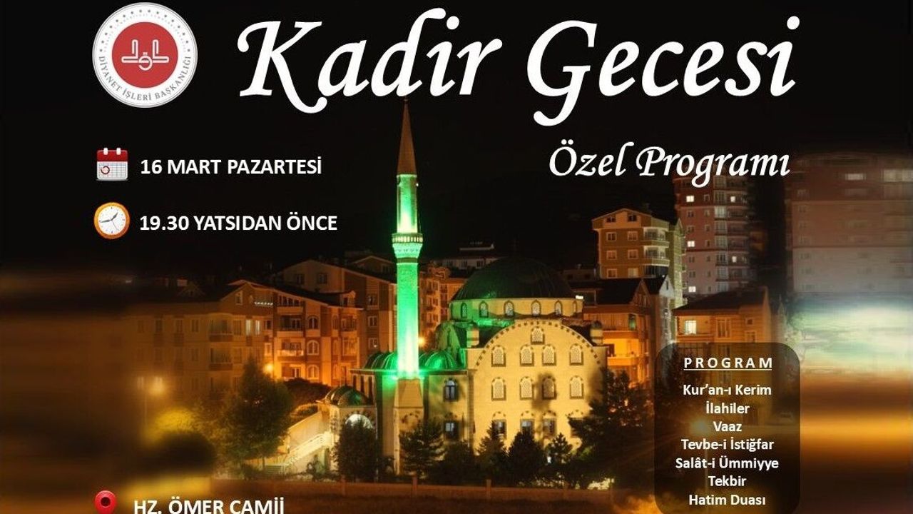 Nevşehir’de İslam âlemi için büyük bir manevi öneme sahip olan Kadir Gecesi, 16 Mart Pazartesi akşamı özel bir programla idrak edilecek. Hz. Ömer Camii’nde gerçekleştirilecek etkinlik, akşam saat 19.30’dan başlayarak yatsı namazından önce tamamlanacak.