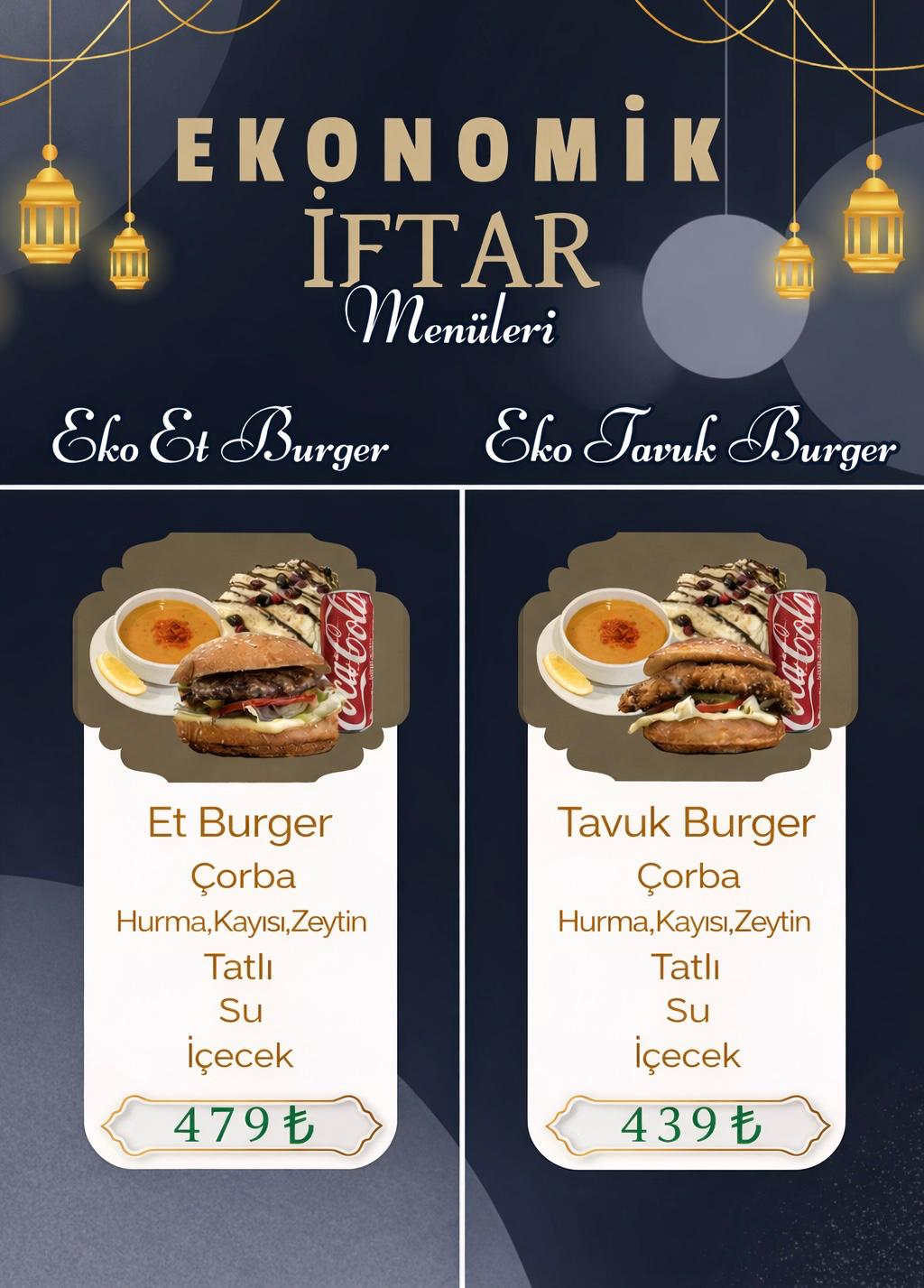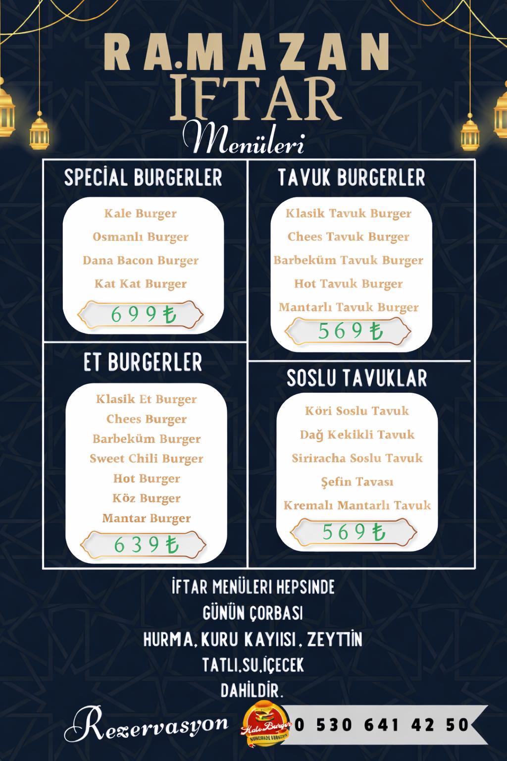 Kale Burger’in Ramazan’a özel ekonomik menüleri, herkesin bütçesine uygun seçenekler sunuyor. Menülerin tamamında günün çorbası, hurma, kuru kayısı, zeytin, tatlı, su ve meşrubat yer alıyor. İftar sonrası keyif çaylarımız ikramımızdır...