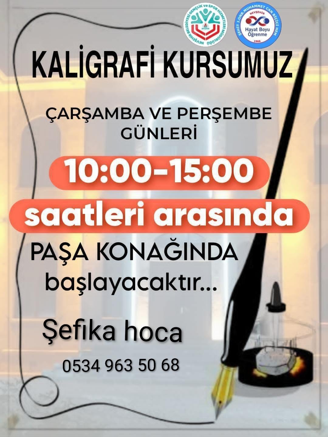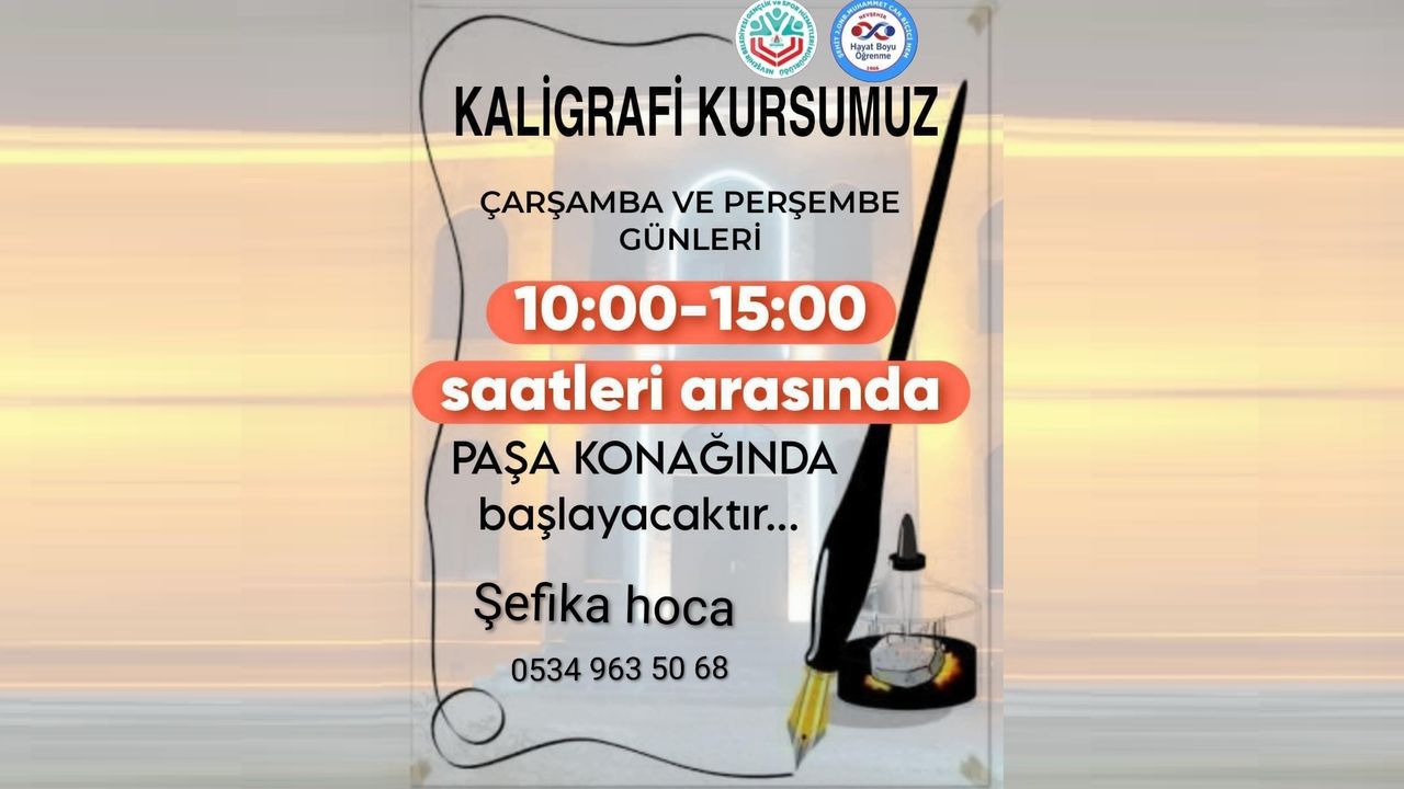 Nevşehir’de sanatsal eğitimlere bir yenisi daha ekleniyor. Gençlik ve Spor Hizmetleri ve Hayat Boyu Öğrenme kapsamında düzenlenen Kaligrafi Kursu, Paşa Konağı’nda başlıyor. Muhammet Can koordinasyonunda gerçekleştirilecek kurs, vatandaşlara el yazısı sanatını öğrenme ve geliştirme fırsatı sunuyor.