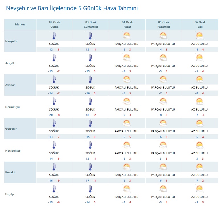 Nevşehir’in ilçelerinde de benzer bir hava durumu beklenirken, en düşük sıcaklıklar Derinkuyu’da görülecek. İlçede gece sıcaklıkları -20 dereceye kadar düşecek.