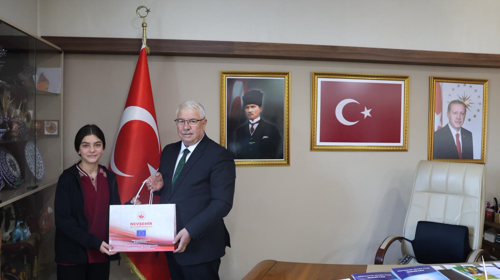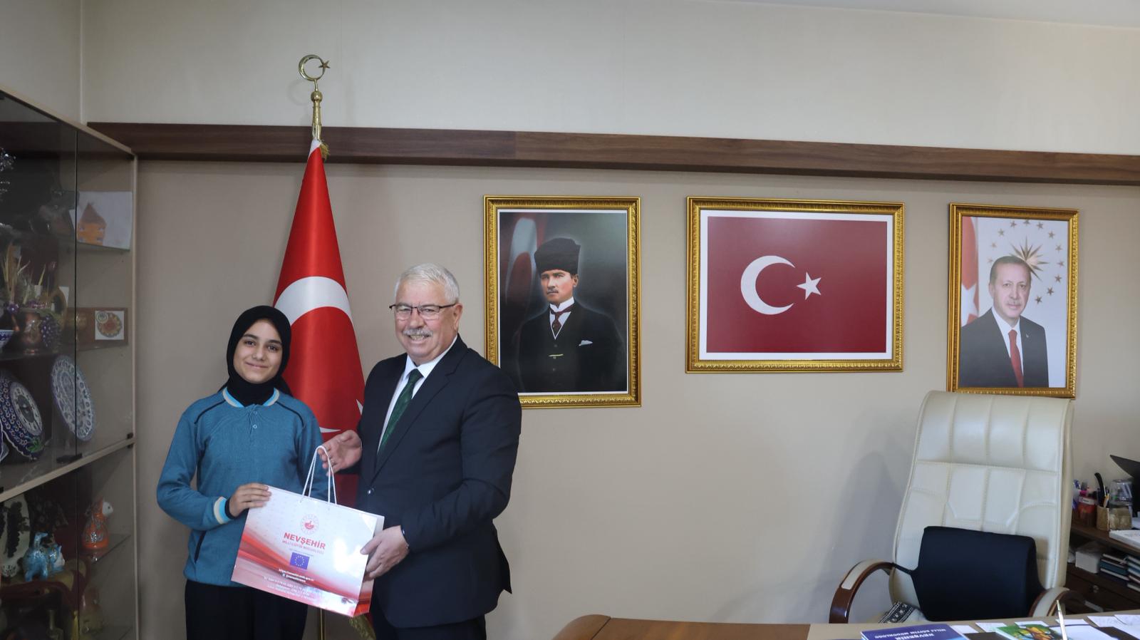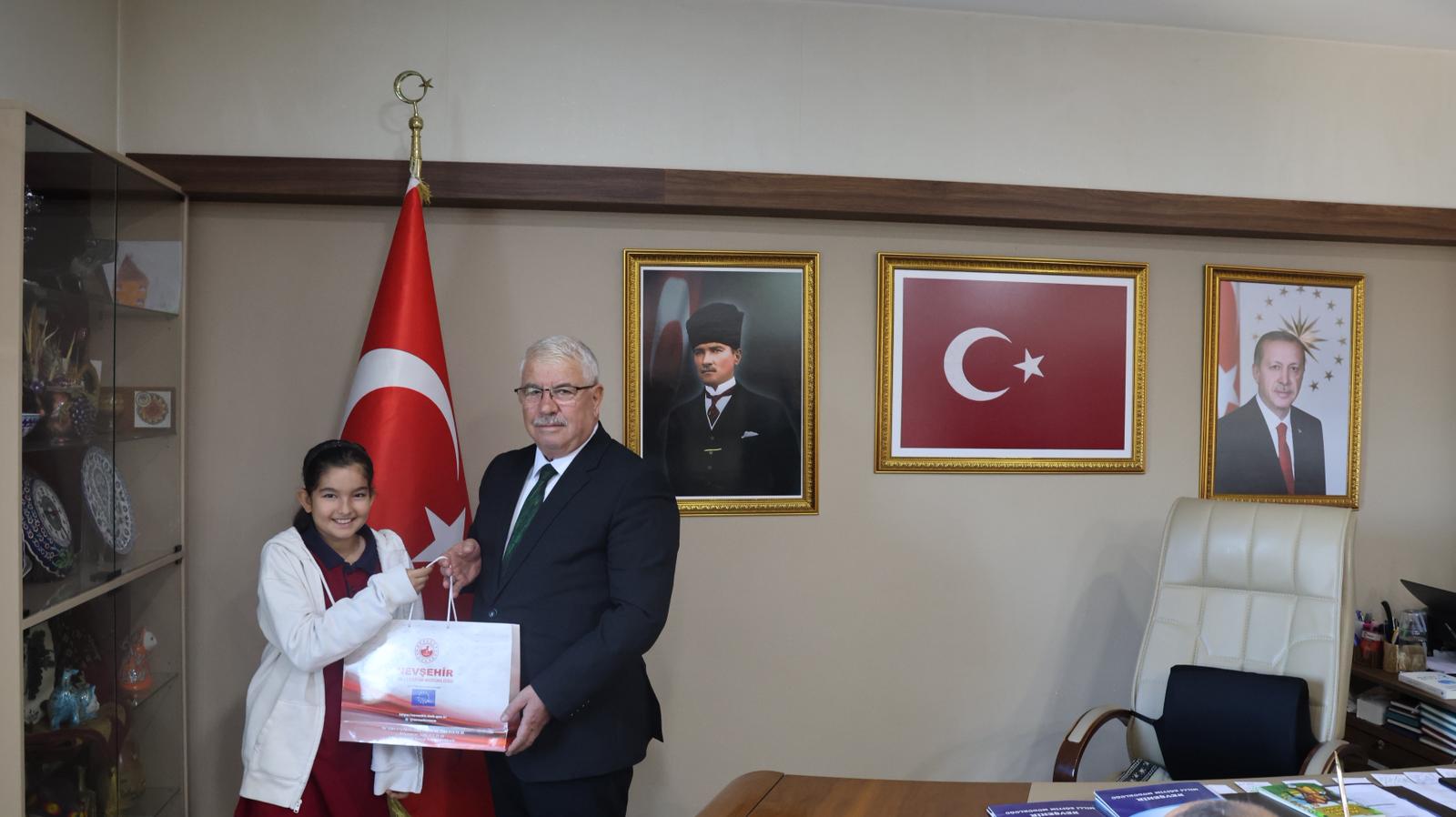 Cumhuriyetin 102. yıl dönümü kutlamaları kapsamında, Millî Eğitim Bakanlığı tarafından düzenlenen “Köklü Geçmişten Güçlü Cumhuriyete” konulu yarışmada, resmî-özel ortaokul öğrencileri şiir ve lise öğrencileri kompozisyon dallarında birbirinden güzel eserleri kaleme aldılar. Dereceye giren öğrencilere ödüllerini, İl Millî Eğitim Müdürü Yusuf Yazıcı takdim etti. İl Müdürü Yusuf Yazıcı, “Cumhuriyet; bir asrı aşan köklü bir miras ve koca bir çınardır. Geçmişimizden aldığımız güçle bu çınarın gölgesinde yetişen nesiller, “Ay Yıldızlı Al Bayrağımızı” ilelebet göklerde dalgalandırmaya devam edecektir.” ifadelerini kullandı. Yazıcı, yarışmaya katılan ve dereceye giren tüm öğrencileri ve ilgili öğretmenleri tebrik ederek başarılarının devamını diledi. Ayrıca, ödül töreninde Nevşehir Spor Lisesi 9.sınıf öğrencisi Ebrar Çolak 9 yaşındayken yazmış olduğu ‘Altın Yumurta Avcıları’ isimli kitabını, İl Millî Eğitim Müdürü Yusuf Yazıcı’ya hediye etti.