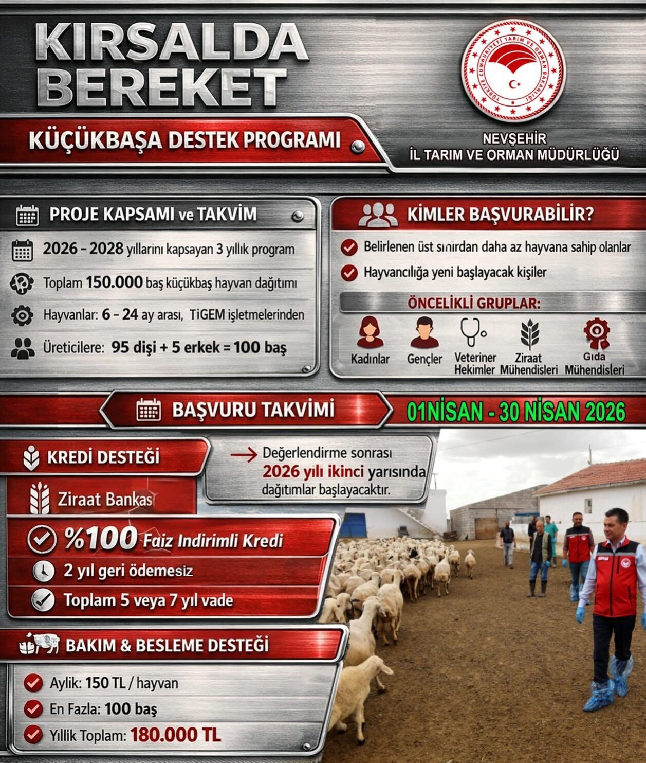 Nevşehir İl Tarım ve Orman Müdürlüğü, 2026-2028 yıllarını kapsayan Küçükbaş Hayvancılık Destek Programı için başvuruların başladığını duyurdu. Program kapsamında toplam 150.000 baş küçükbaş hayvan üreticilere dağıtılacak.