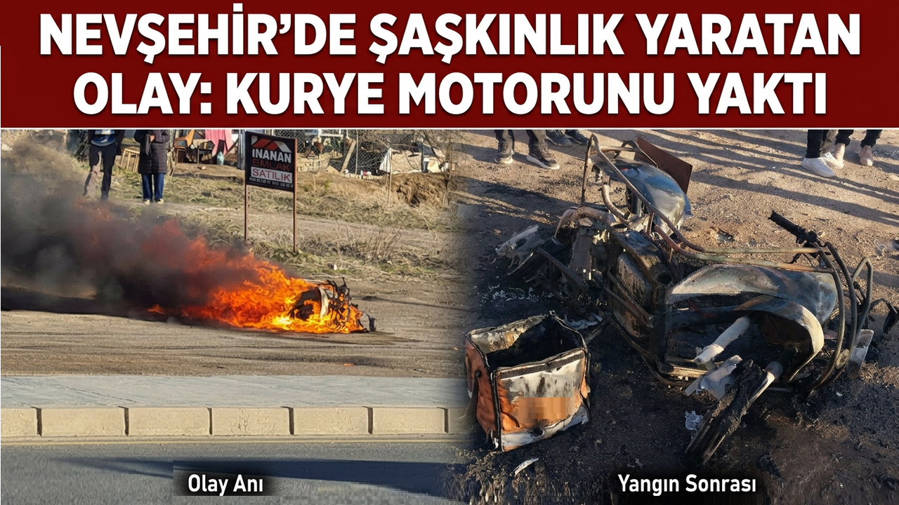 Edinilen bilgilere göre, Nevşehir Mehmet Akif Ersoy Mahallesi, Yavuz Sultan Selim Caddesi, Yeni TOKİ 1. Etap’ta ilginç bir olay yaşandı. Plakası ve ismi öğrenilemeyen bir kurye, henüz bilinmeyen bir sebeple Viva düğün salonu yanındaki boş arazide motosikletini ateşe verdi. Sürücü daha sonra olay yerinden uzaklaştı.