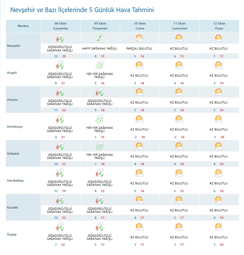 • 8–9 Ekim: Nevşehir ve ilçelerinde gök gürültülü sağanak yağışlar bekleniyor. Sıcaklıklar gündüz 15–24°C arasında, gece ise 1–12°C aralığında seyredecek.