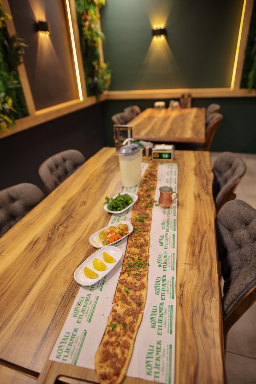 Mekana gelen misafirler, hem enfes etli ekmeğin tadını çıkarıyor hem de sınırsız yayık ayranla serinleyebiliyor. Konyalı Etli Ekmek, boy ölçüsüne göre hazırladığı dev etli ekmekleriyle de dikkat çekiyor.